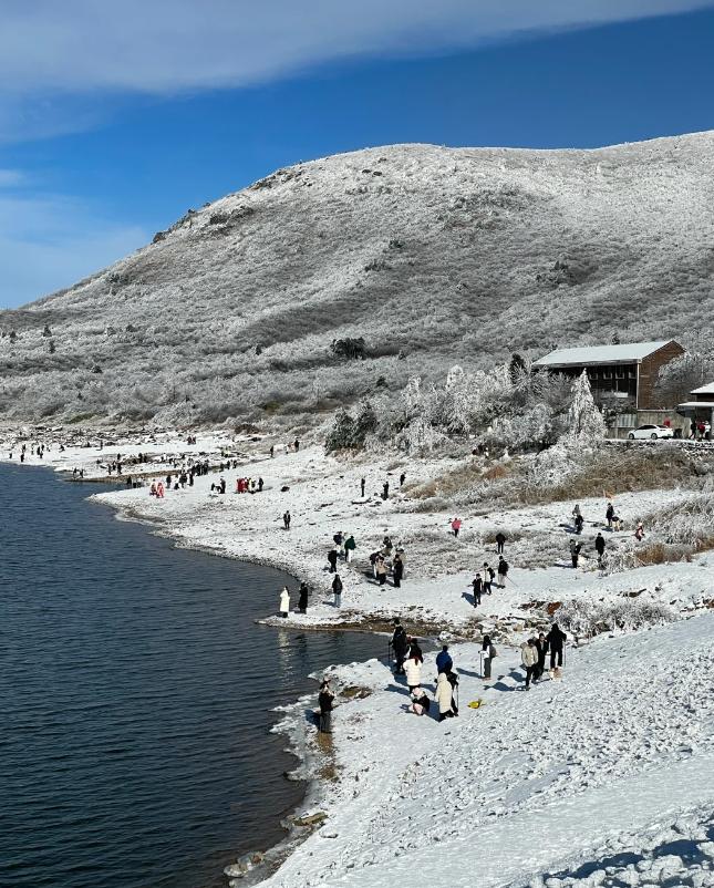 這裏不僅是國家一級保護動物梅花鹿的棲息地,更是一下雪就美成仙境的山湖祕境。站在天池邊,映入眼簾的是湖水清冽幽藍,水天一色,山巒緩伏,是獨屬於南方的秀雅和靜美。