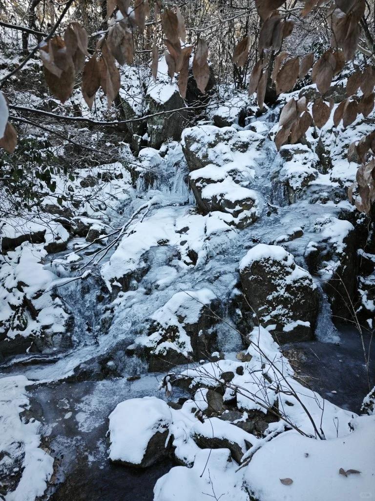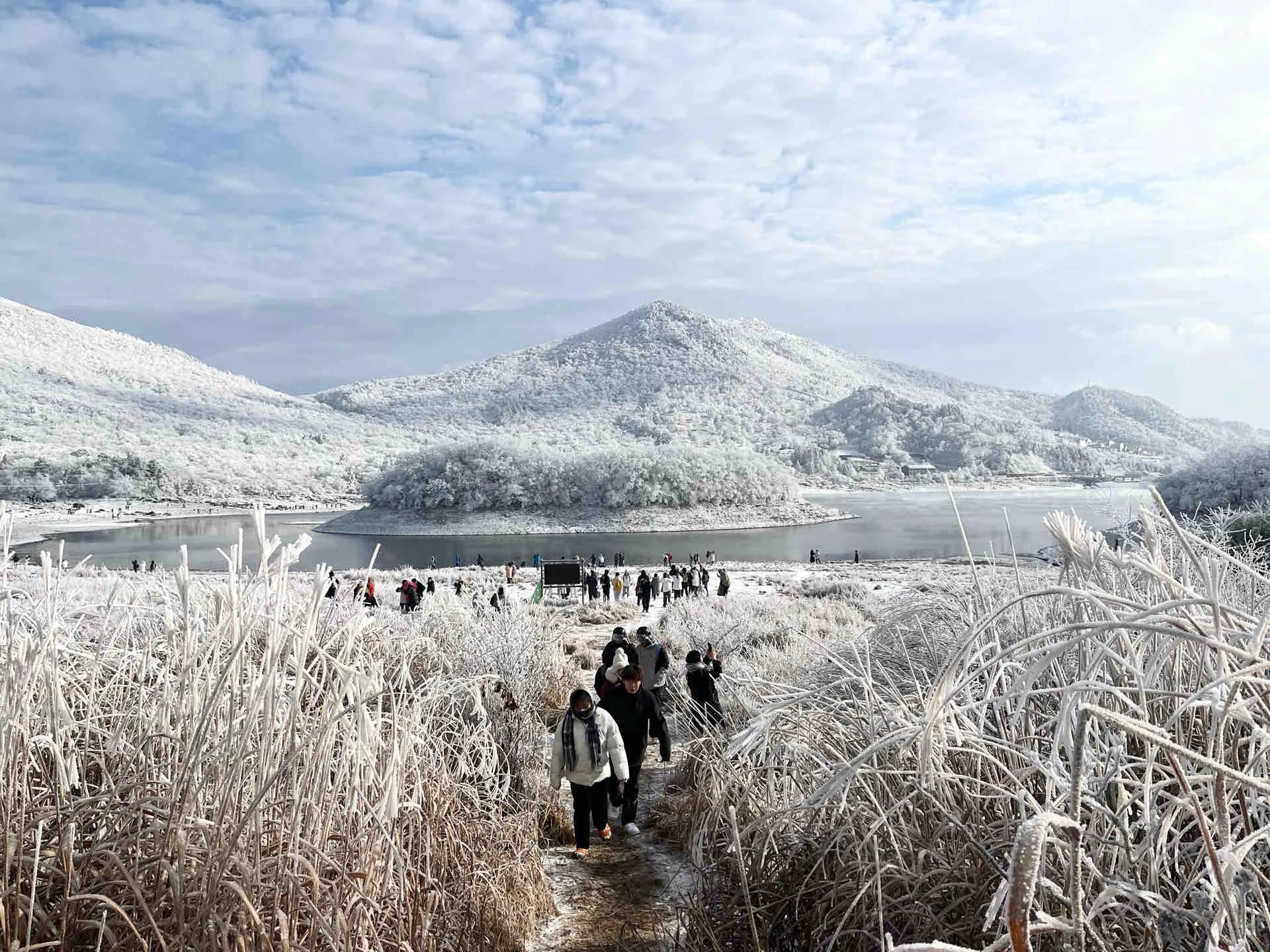 這西天池也是徒步和登山愛好者的旅行天堂,沿着吳越古道往上走,曲徑通幽,跌宕起伏,還能看到霧凇,宛如北國風光。