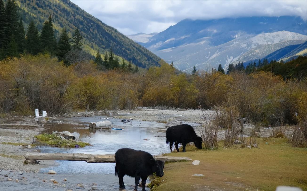 山上終年積雪,孕育了山下的牧場和湖水,牧場中可以看到成羣的犛牛和蜿蜒的雪山融水形成的河流,畫面安靜又充滿張力。