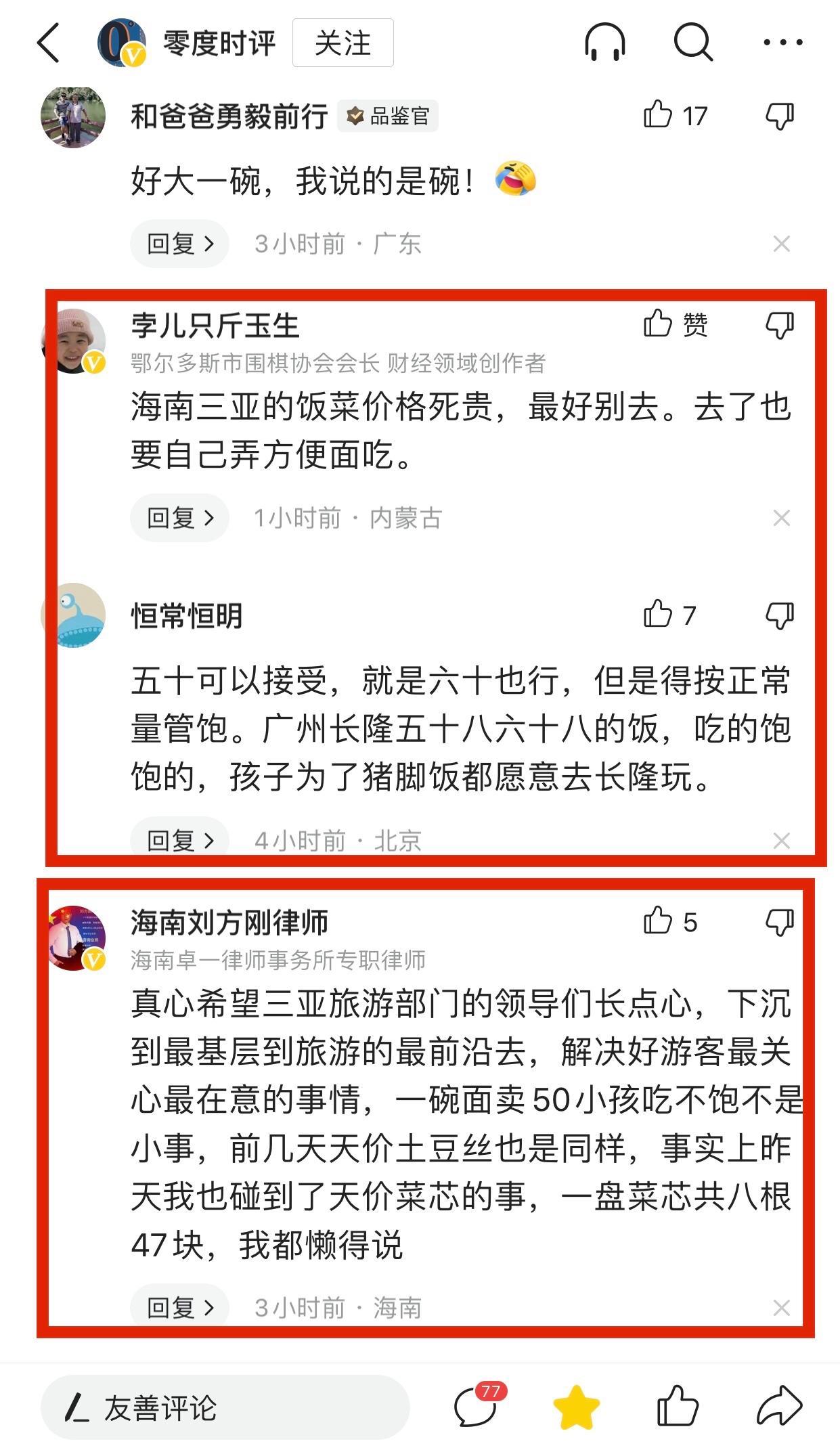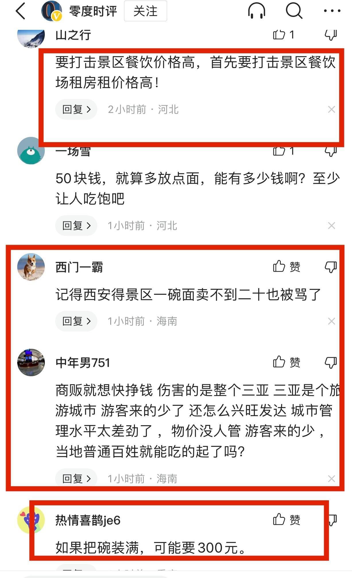 三亞這些景區都不是高海拔,也不是崎嶇山路,像什麼泰山,華山西藏新疆偏遠地區,你人工運輸成本大賣50元100元一碗可以,遊客能理解,大平路,景區車直接運輸到裏面,無非成本就是房租高點,你賣貴點可以理解,你得把人管飽,不管飽,不致於離譜到這個程度,2023年春節假期,西安一碗油潑面賣20元,裏面也是隻有6根面,最後視頻上了熱搜,當地文旅部門快速出擊,要求店家給遊客退一賠三,佩禮道歉,店鋪整改,提升麪條數量,最後這家店經不住輿論攻擊,自己就關門了。