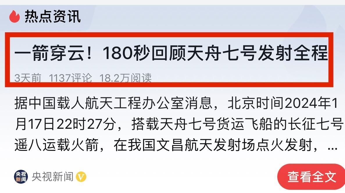 2024年1月17日22時27分,海南文昌火箭發射場天舟七號貨運飛船的長征七號遙八運載火箭騰空九霄、進入太空,約3小時後與“天宮”順利交會對接,2024年文昌發射場第一個任務圓滿完成。
