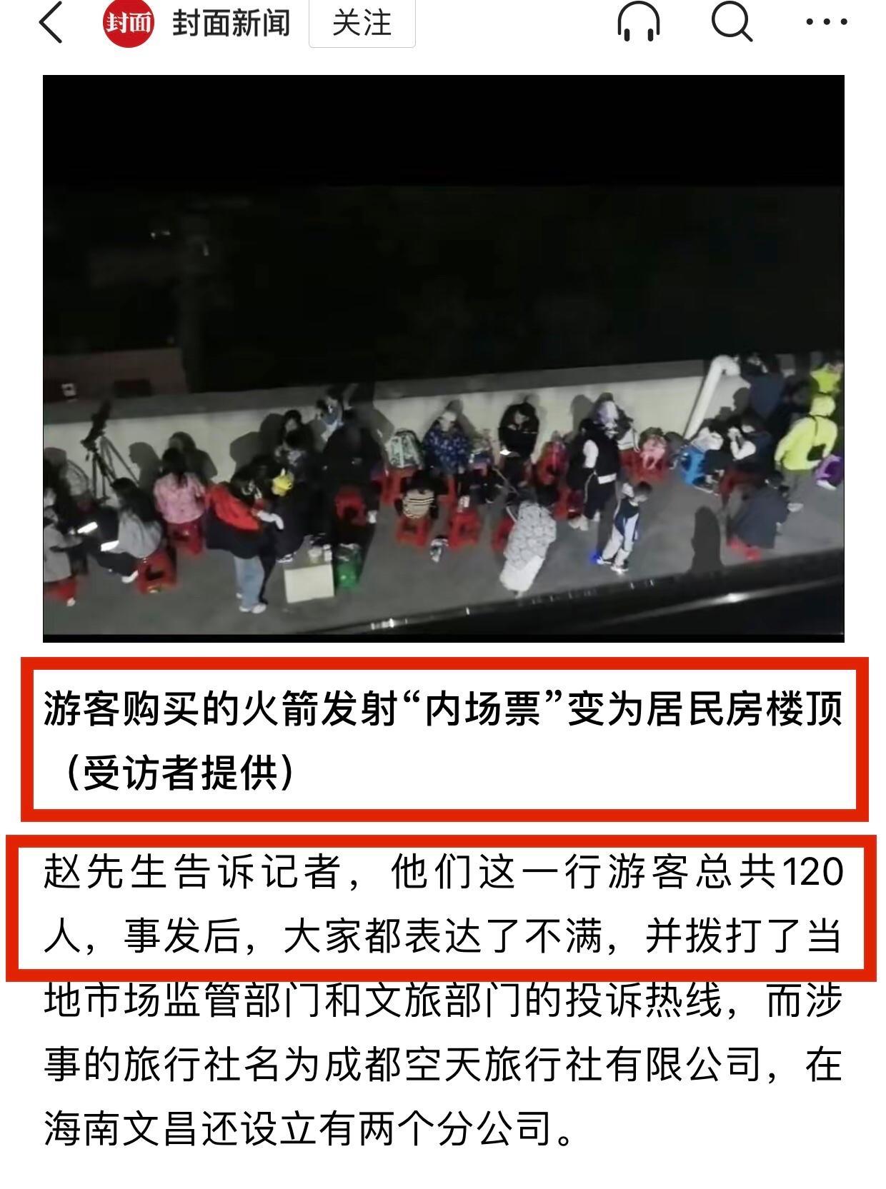 參觀火箭發射在航天發射場內能近距離觀看,就如同演唱會一樣,分場外票和場內票,vip肯定價格比較高,也能得到最好視覺觀感,這次文昌天舟七號發射,有120名遊客遭遇了一些黃牛旅行社無證經營套路,對外宣傳遊客買了場內票可以觀看天州七號發射,門票2888元,結果真正到了發射觀看1月17號前幾個小時,這120名遊客被帶到了附近一個居民樓頂,雖然能看到火箭發射,但是旅行社宣傳的是在火箭發射vip位置觀看,與事實嚴重不符,引發遊客集體不滿,導遊解釋是場內票臨時變動無法到現場近距離觀看火箭發射,當事遊客趙先生表示,最後文旅局介入他們被拉到了一個海灘觀看火箭發射,但是由於遊客太多,效果還是不好,目前這120名遊客已經向海南文昌文旅局投訴,要求涉事旅行社退一賠三。