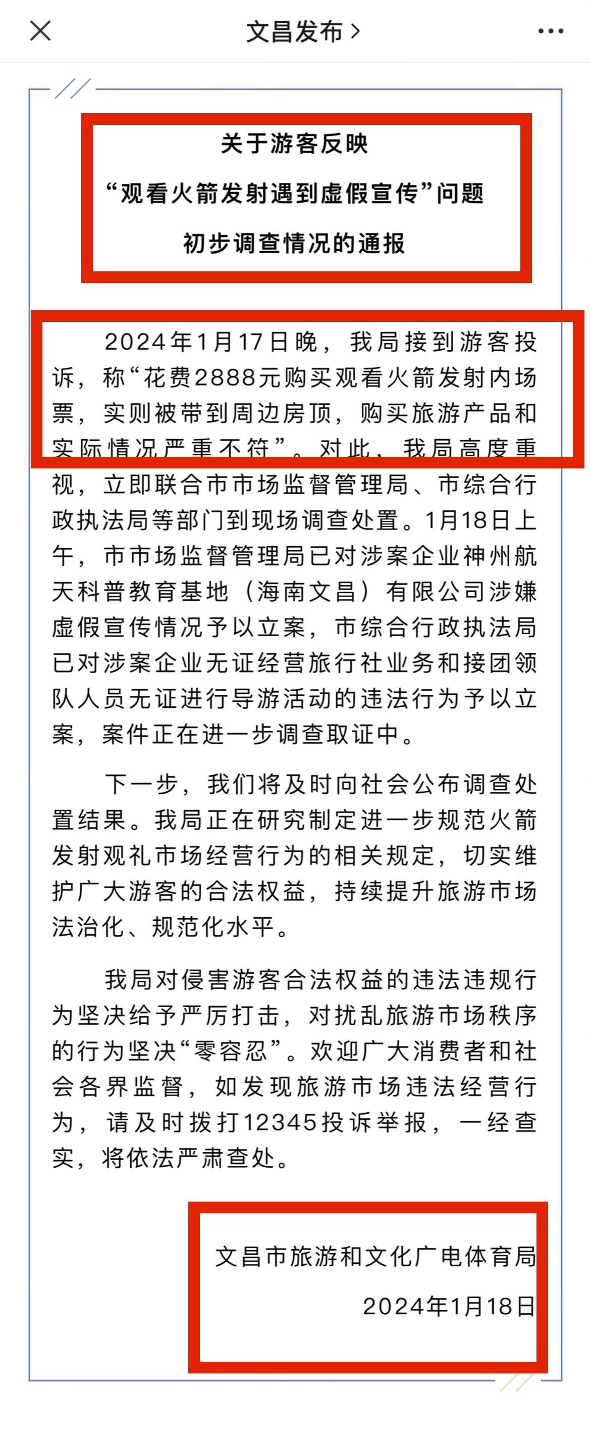 來自《文昌發佈》官媒消息,是已經對兩家旅行社進行調查,對無證經營和涉及虛假宣傳旅行社和導遊零容忍態度處理,會給遊客一個滿意交代。