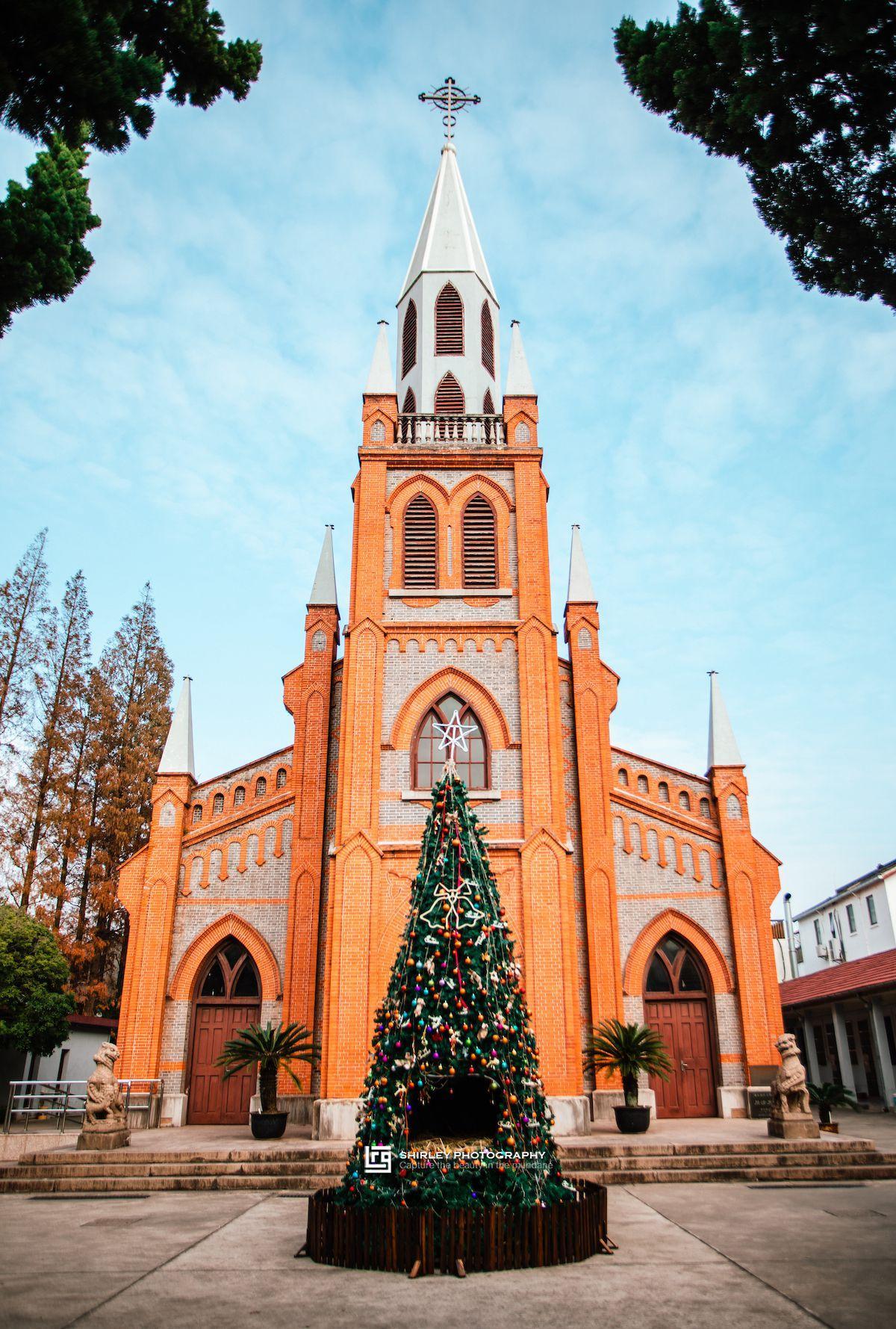 穿過場署街那西式的牌樓,進去十幾米就是川沙天主堂,清同治十一年(1872)建成。教堂建築平面呈拉丁十字式,大廳爲巴西利卡式,外形是單鐘塔哥特式。當時聖誕節剛過,聖誕佈置還未拆除,整個教堂看上去光鮮亮麗。可惜平日裏只能站在牆外欣賞,無法入內。