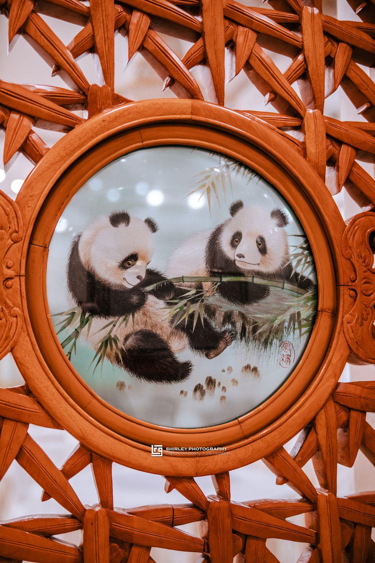 四川廳陳設以竹器爲主,配以蜀繡、漆器和白銀製品,盡頭是芙蓉錦鯉雙面屏風。果不其然在這裏發現了熊貓元素,不愧是四川廳。