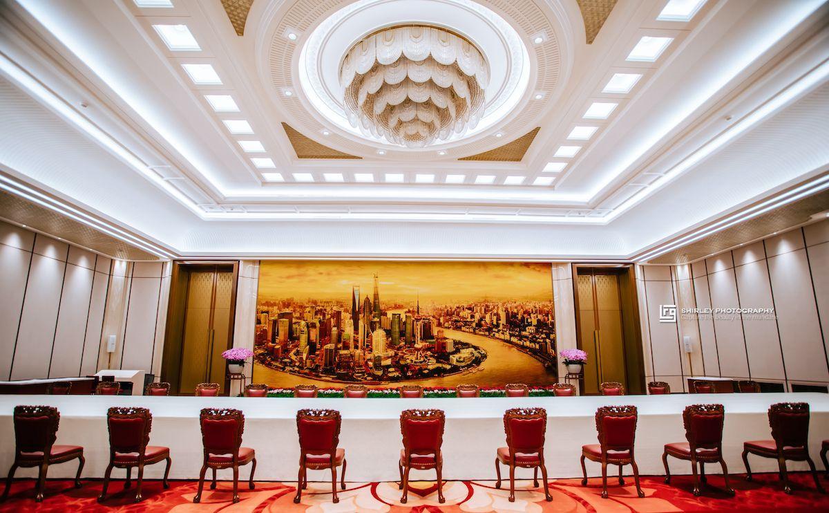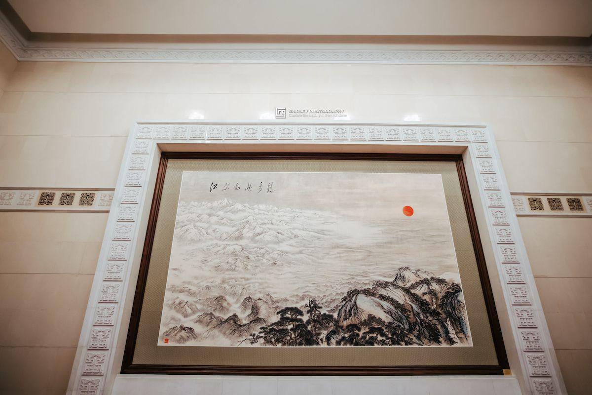 上海廳,大廳裝修風格融合了上海的地域特點,比如進門第一眼看到的就是《浦江兩岸盡朝暉》巨幅藝術壁畫。會場中間已經佈置完畢,沒看到花朵地毯的全貌。