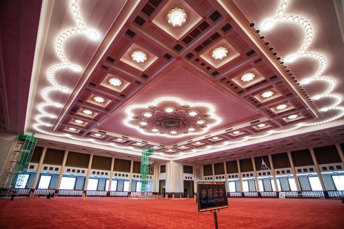 最值得留意的是頂部中央那紅寶石般的巨大紅色五角星燈,周圍有56盞小燈,象徵56個民族。新聞照片上有大禮堂全開燈的照片,頂棚滿天星燈交相輝映,烘托出了一種團結向上的氛圍。