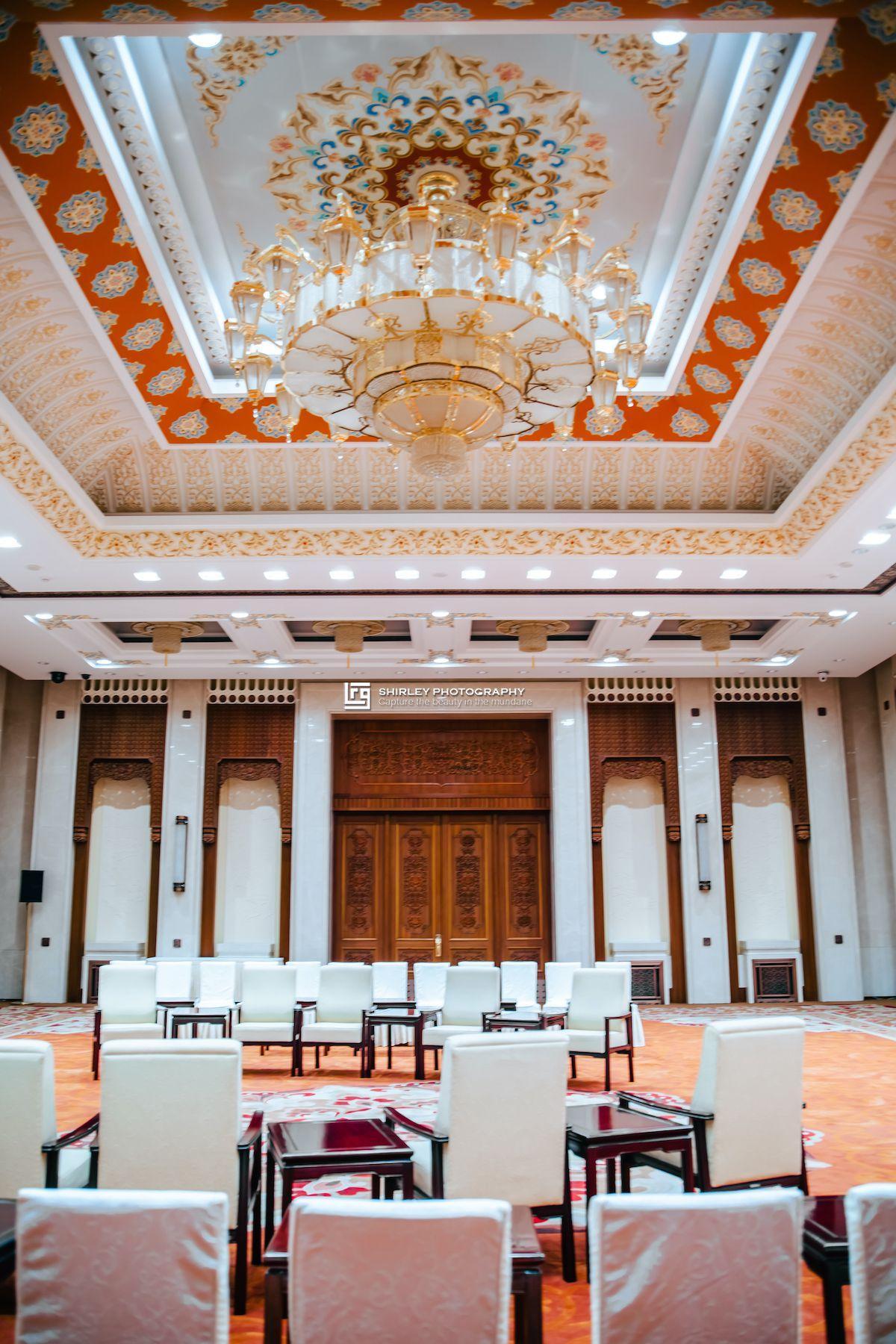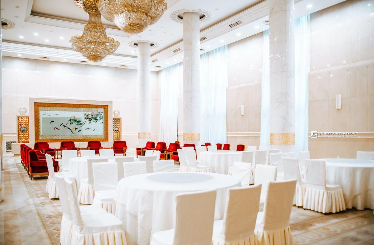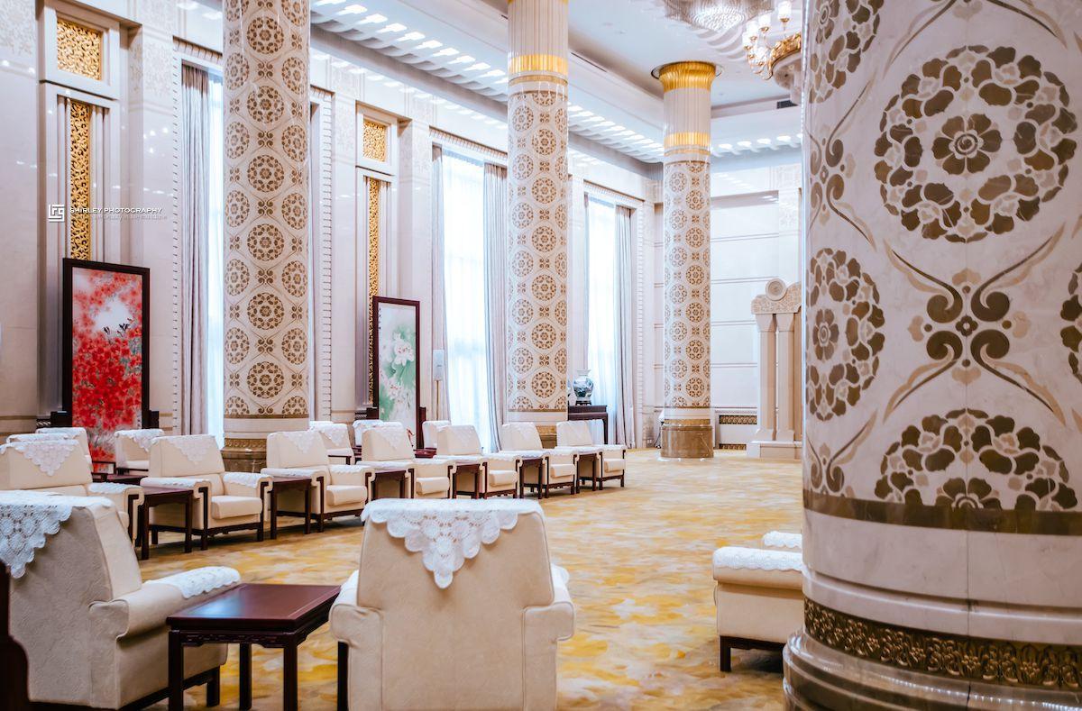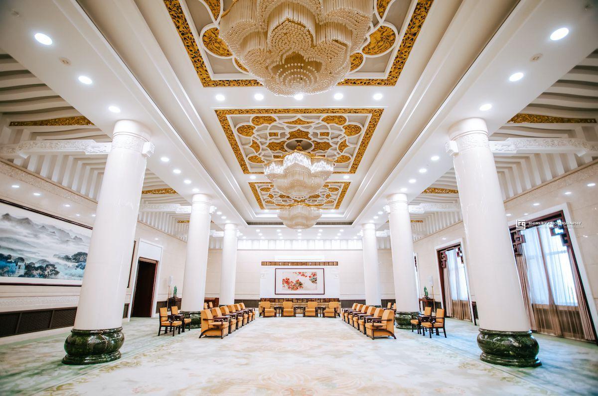 宴會廳,沒有開燈和擺放圓桌椅的宴會廳和新聞上看到的有些聯繫不起來。但是頂部中央鑲嵌着的水晶玻璃吸頂大花燈、以及四周點金石膏雕塑和棋盤式的彩色藻井,還是讓人一眼認出了這裏是新聞裏的國宴廳。整個大廳面積7000多平方米,可以舉行5000人的宴會或1萬人的酒會。可以想像一下這裏賓朋滿座的熱鬧場景。