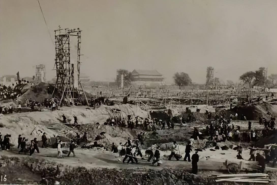 爲了保障地基的牢固,8米的地基挖掘工程量巨大,由於當時沒有先進的施工設備,只能靠純人力。人手不夠,指揮部只能向全北京發出號召。有數據統計,前後有30萬人義務參與到了地基挖掘工程之中,他們來自全國各地。甚至是當年來京出差的,都會去工地上幹兩天活。