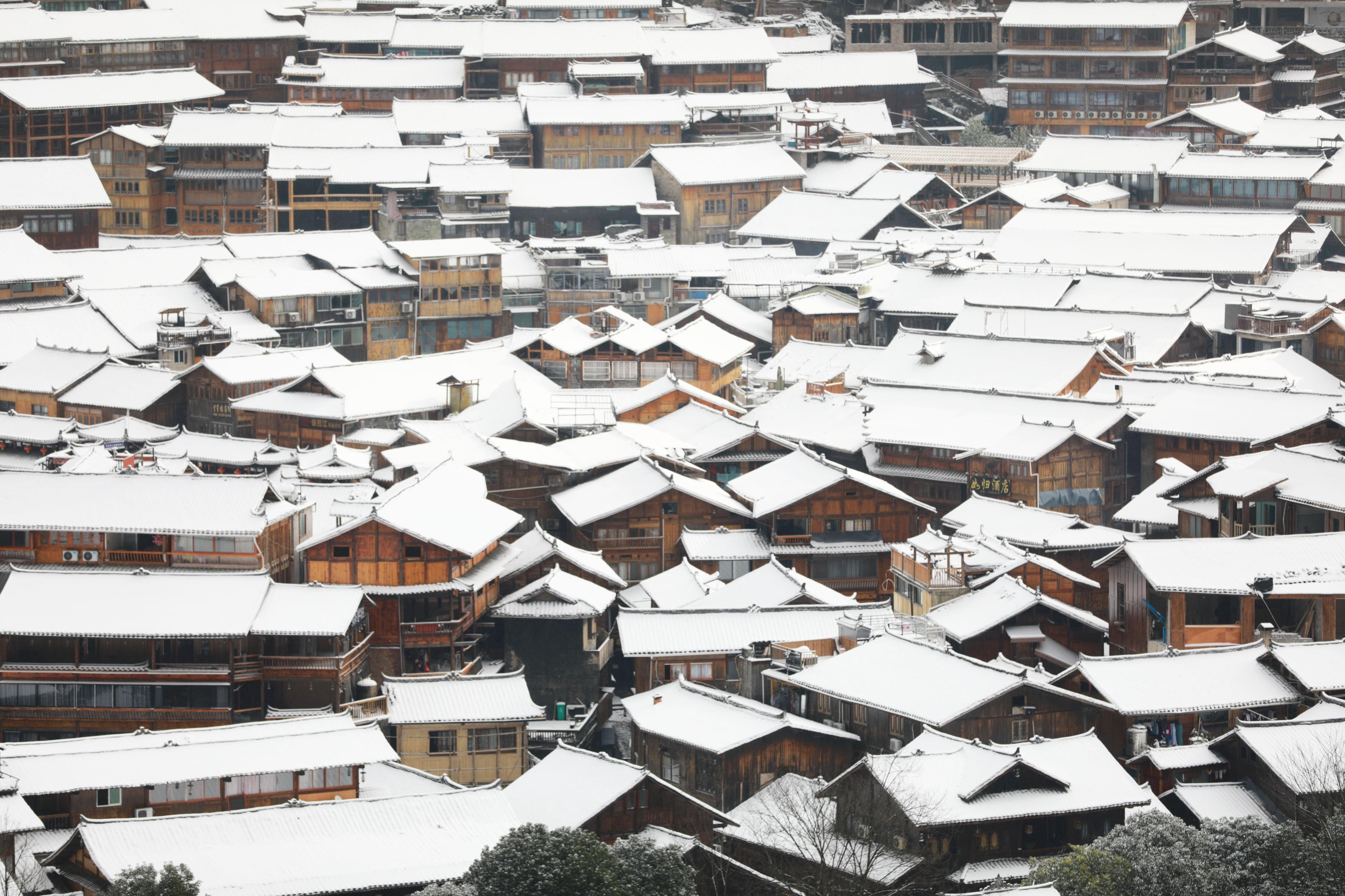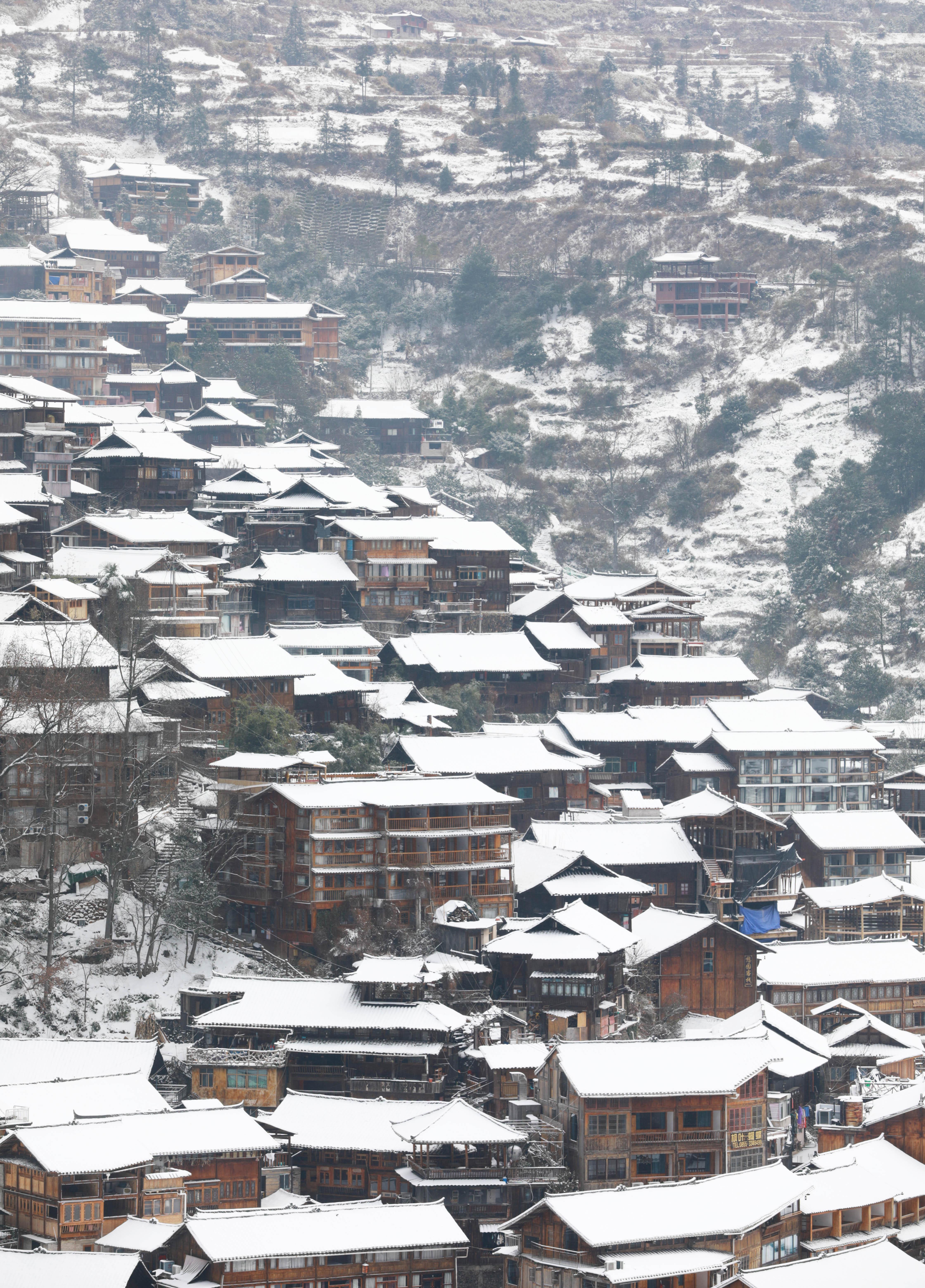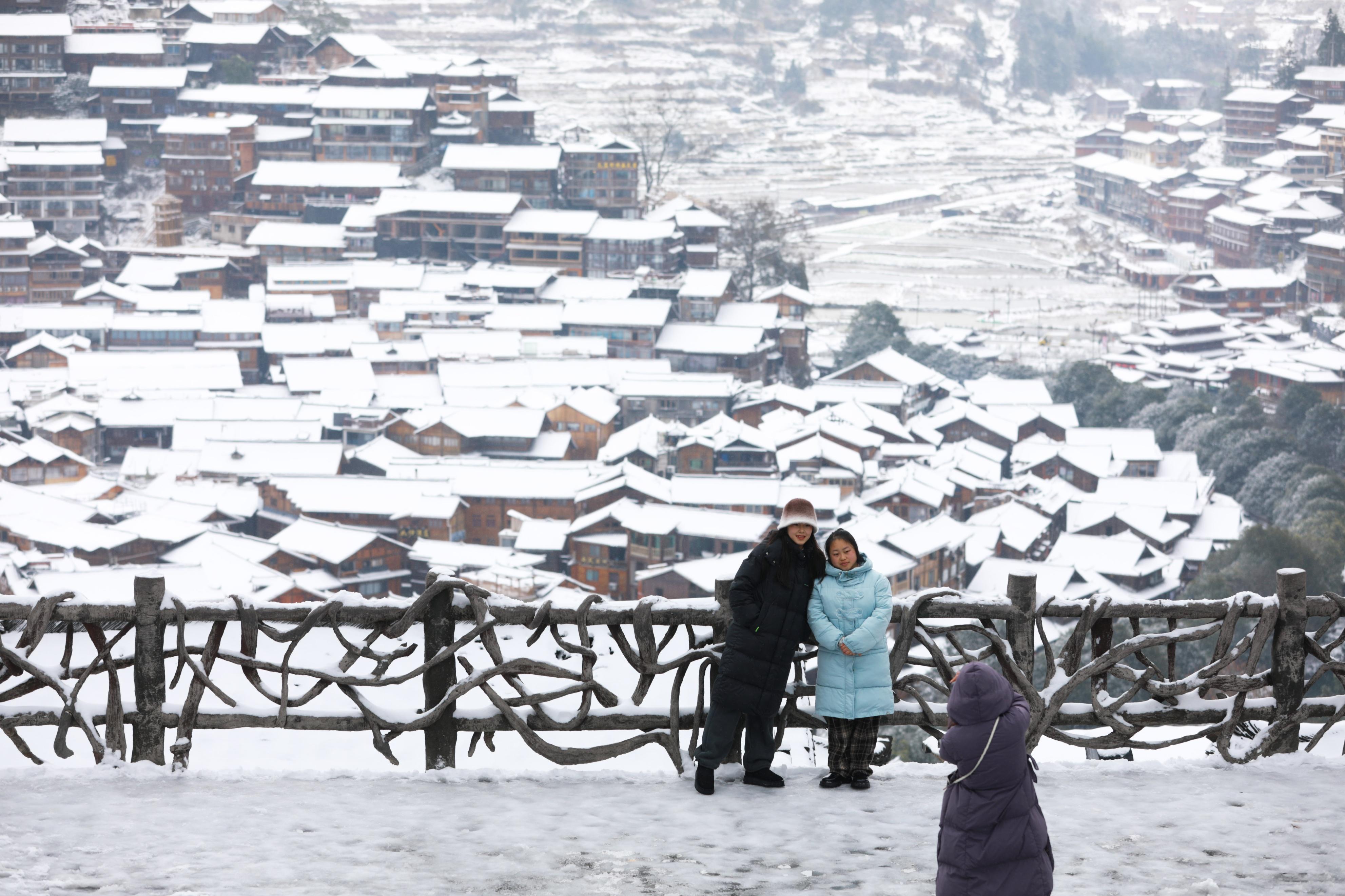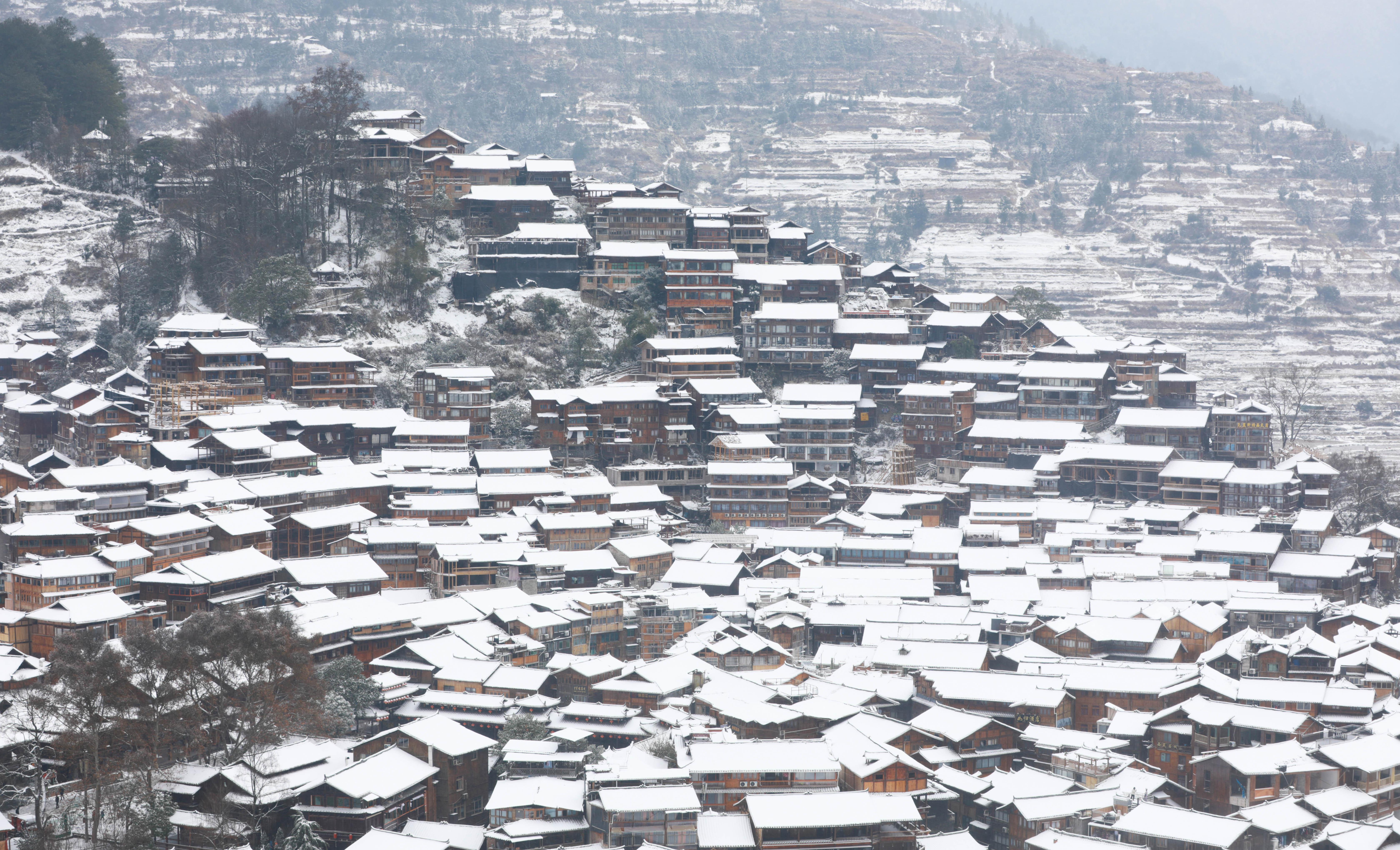 1月22日,貴州省黔東南苗族侗族自治州雷山縣西江千戶苗寨迎來2024年第一場雪。一夜之間,西江千戶苗寨披上“銀裝”,掛滿白雪,獨特的苗寨雪景,吸引不少遊客觀賞。