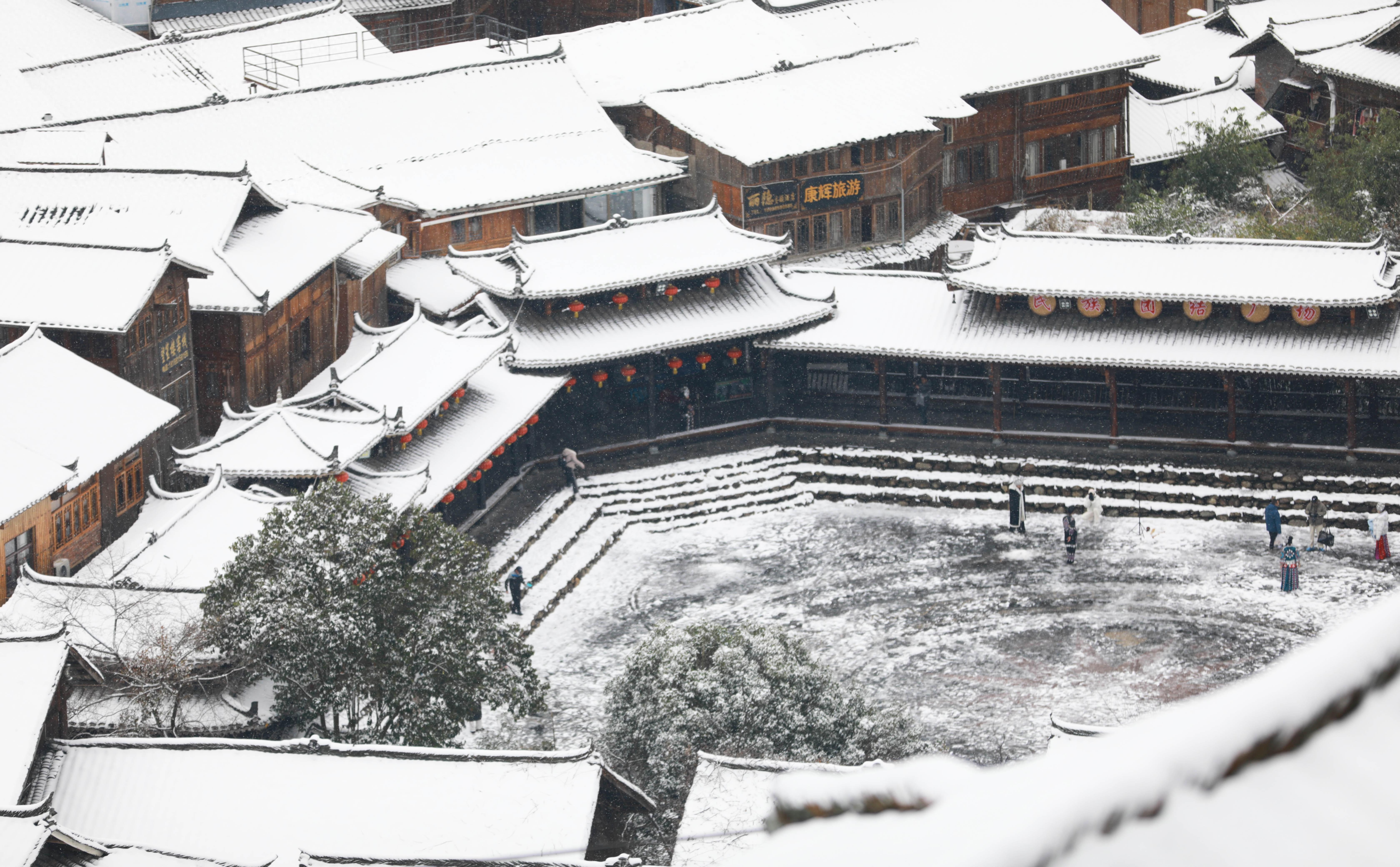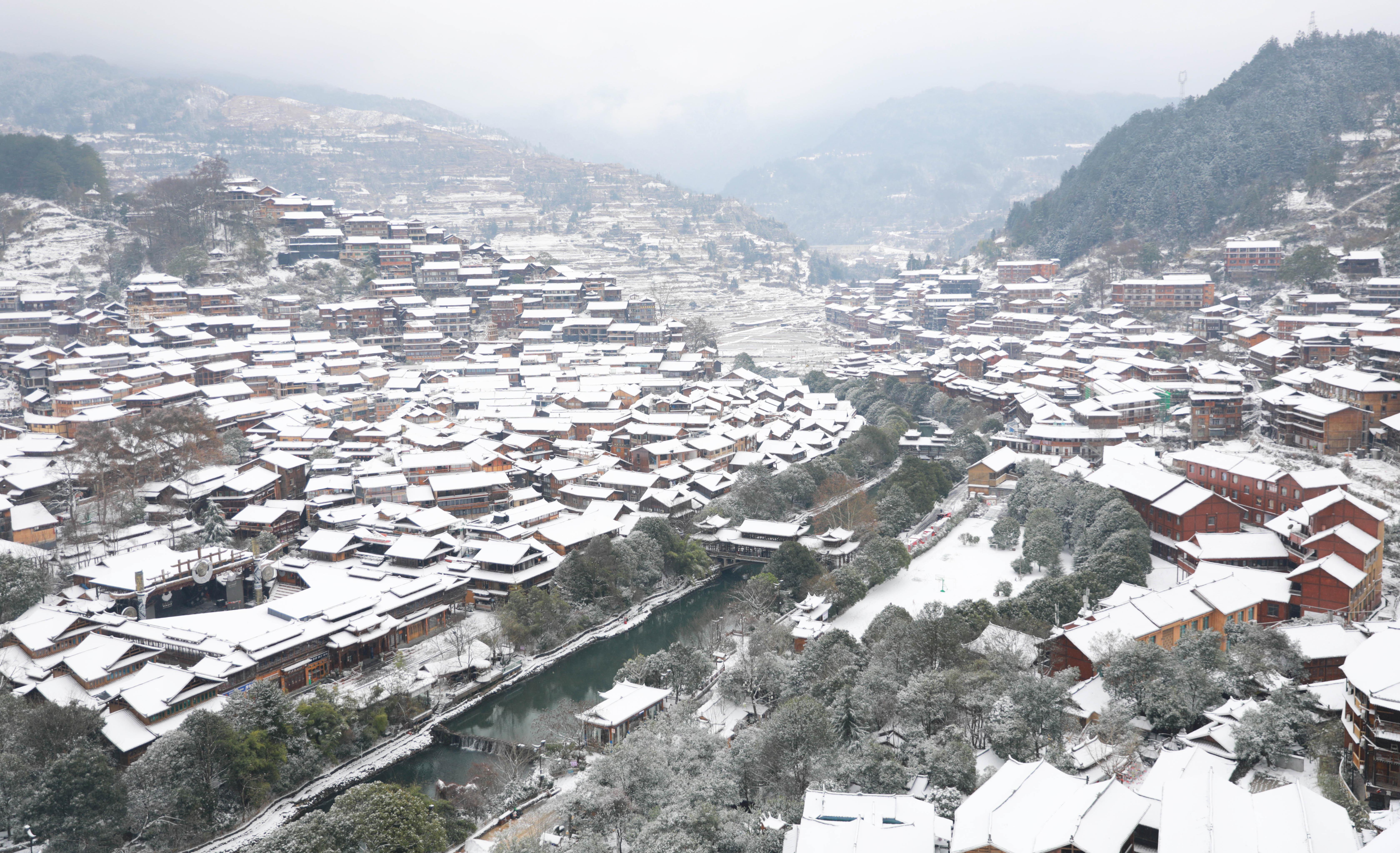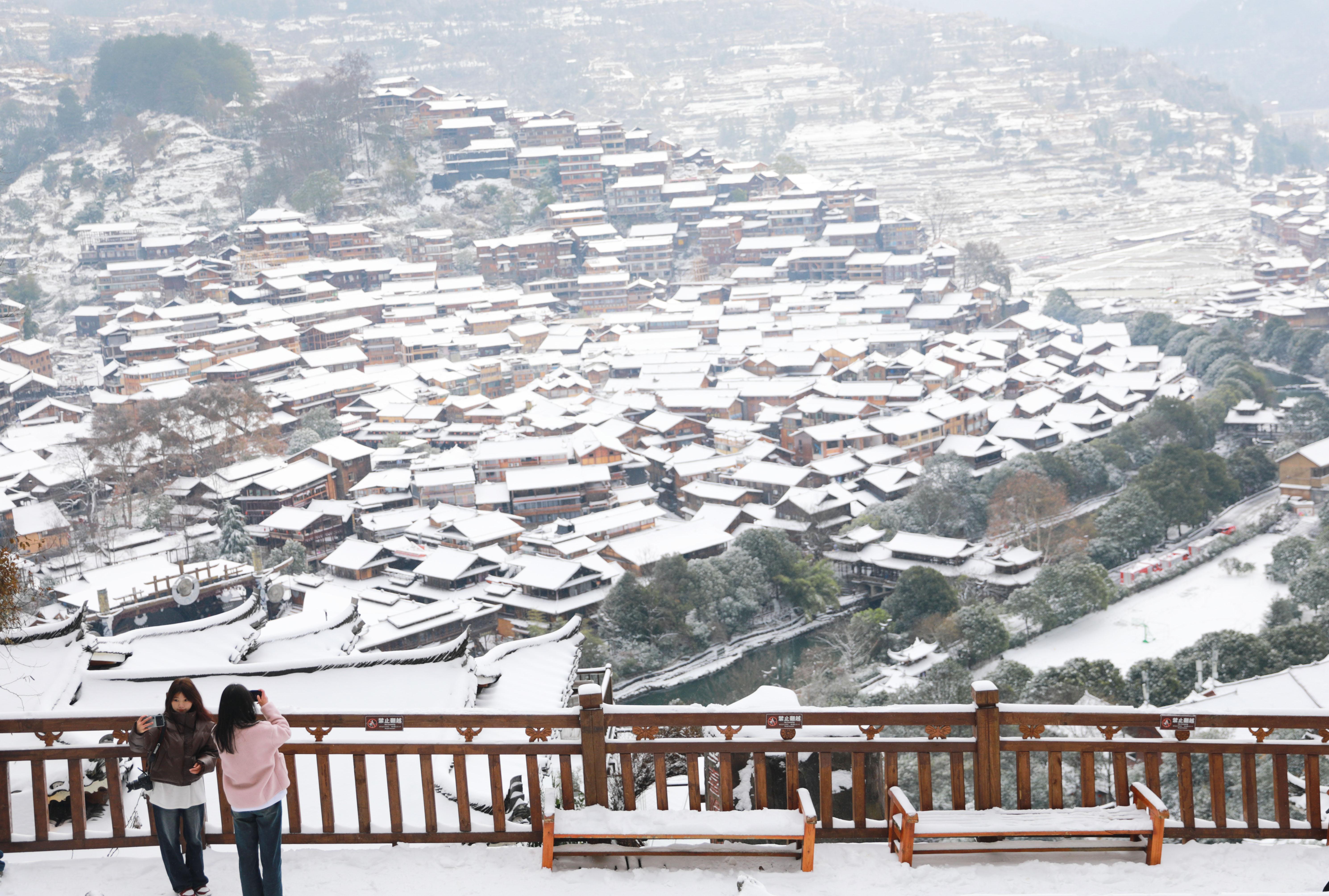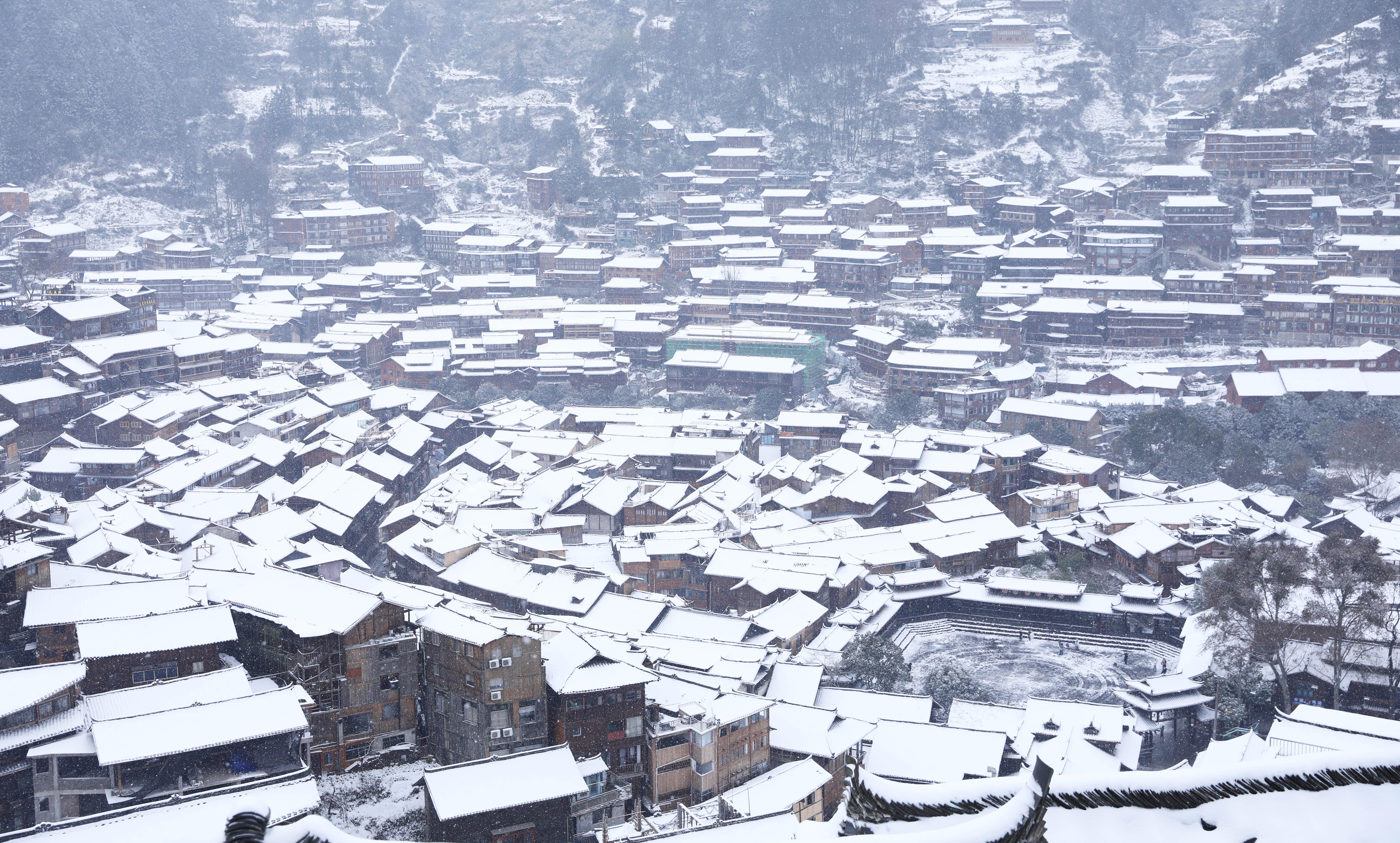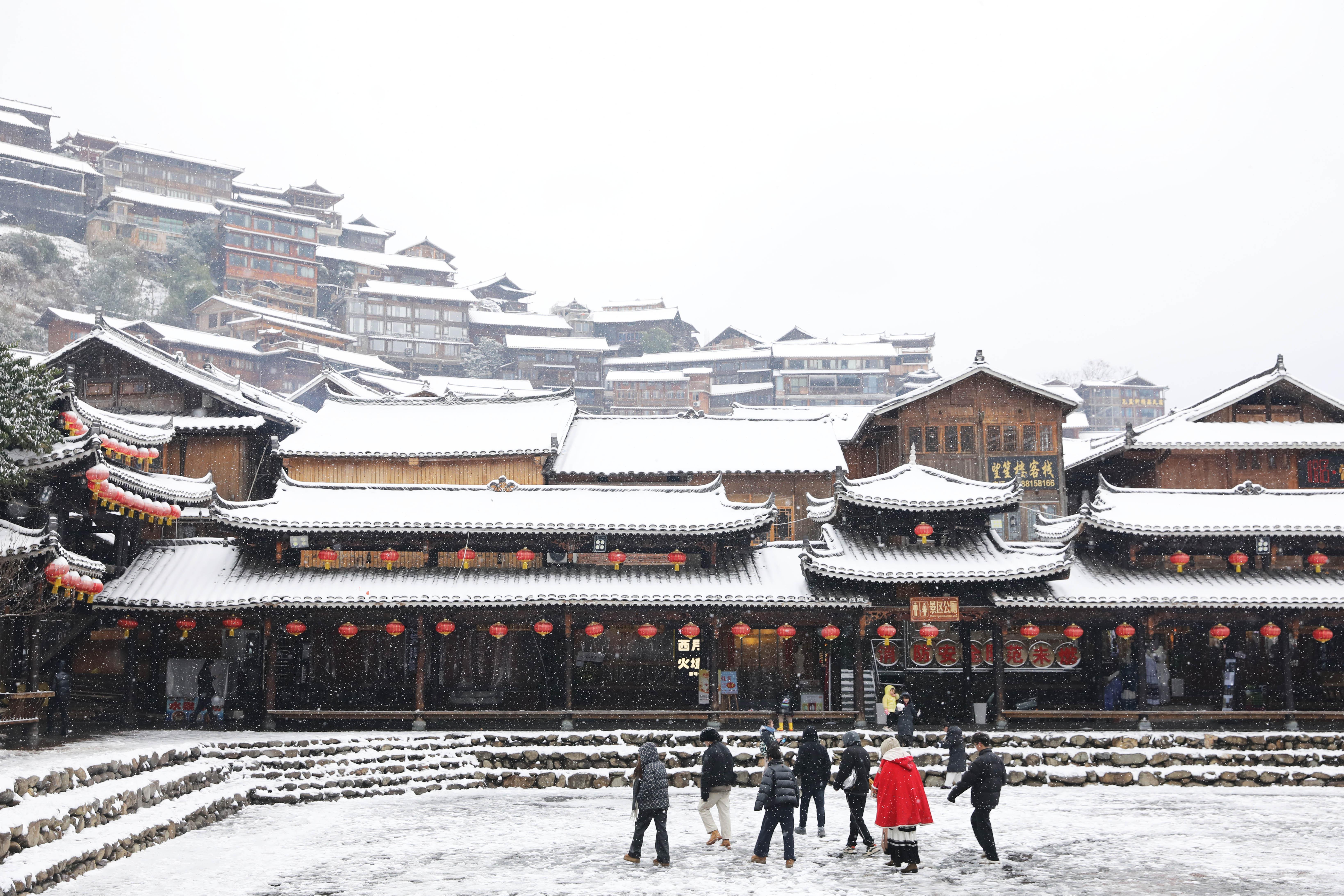 1月22日,貴州省黔東南苗族侗族自治州雷山縣西江千戶苗寨迎來2024年第一場雪。一夜之間,西江千戶苗寨披上“銀裝”,掛滿白雪,獨特的苗寨雪景,吸引不少遊客觀賞。