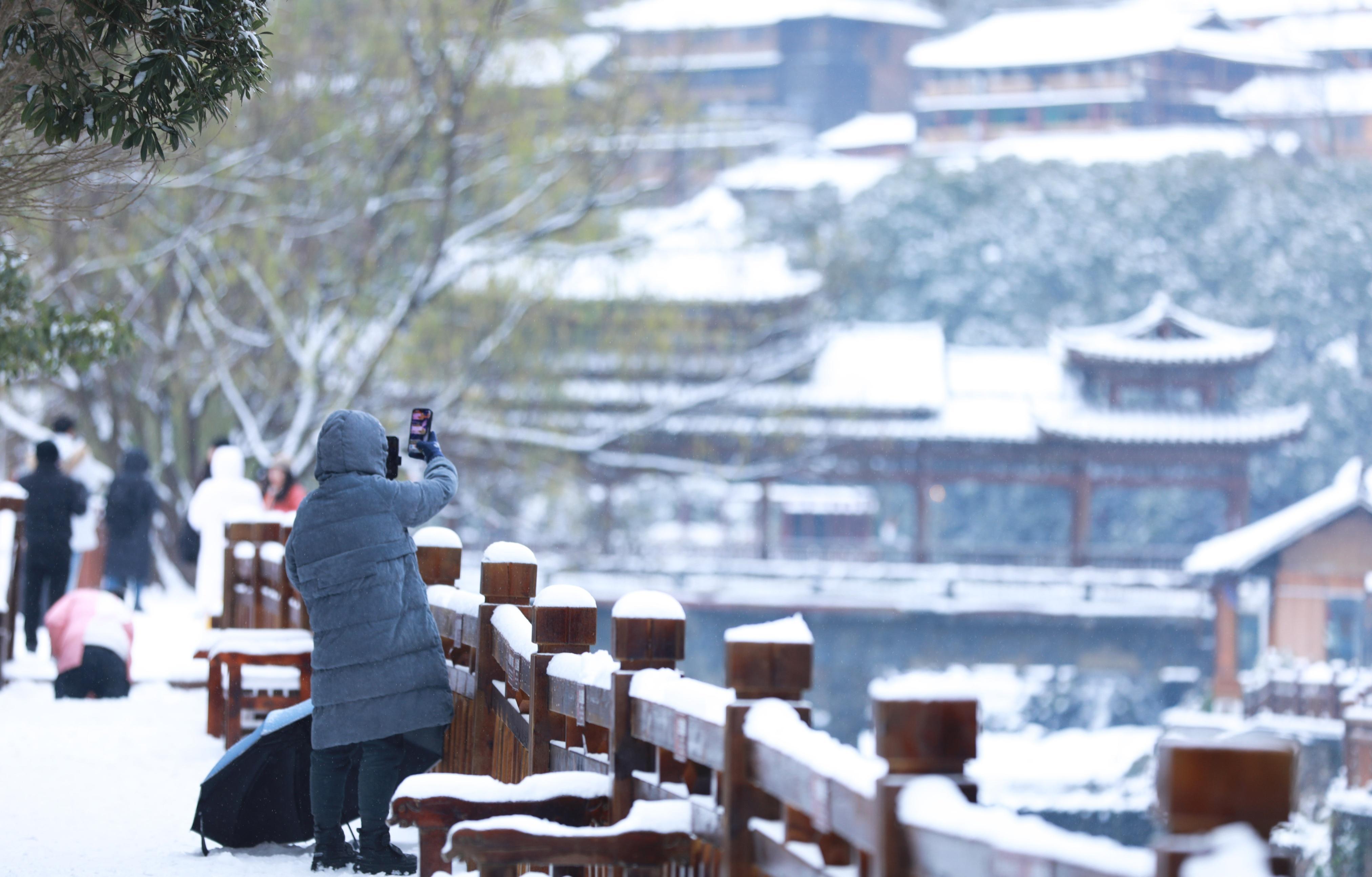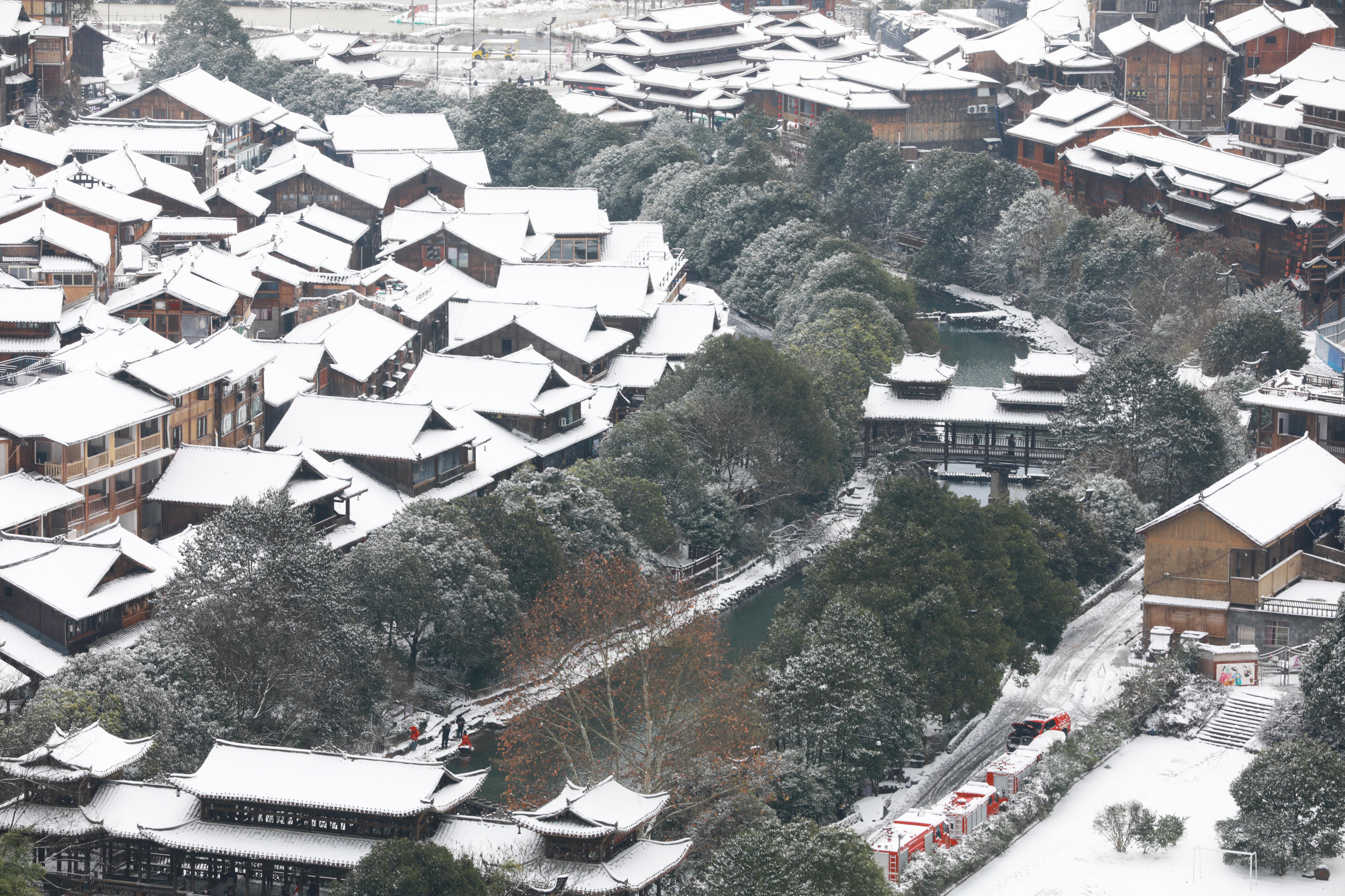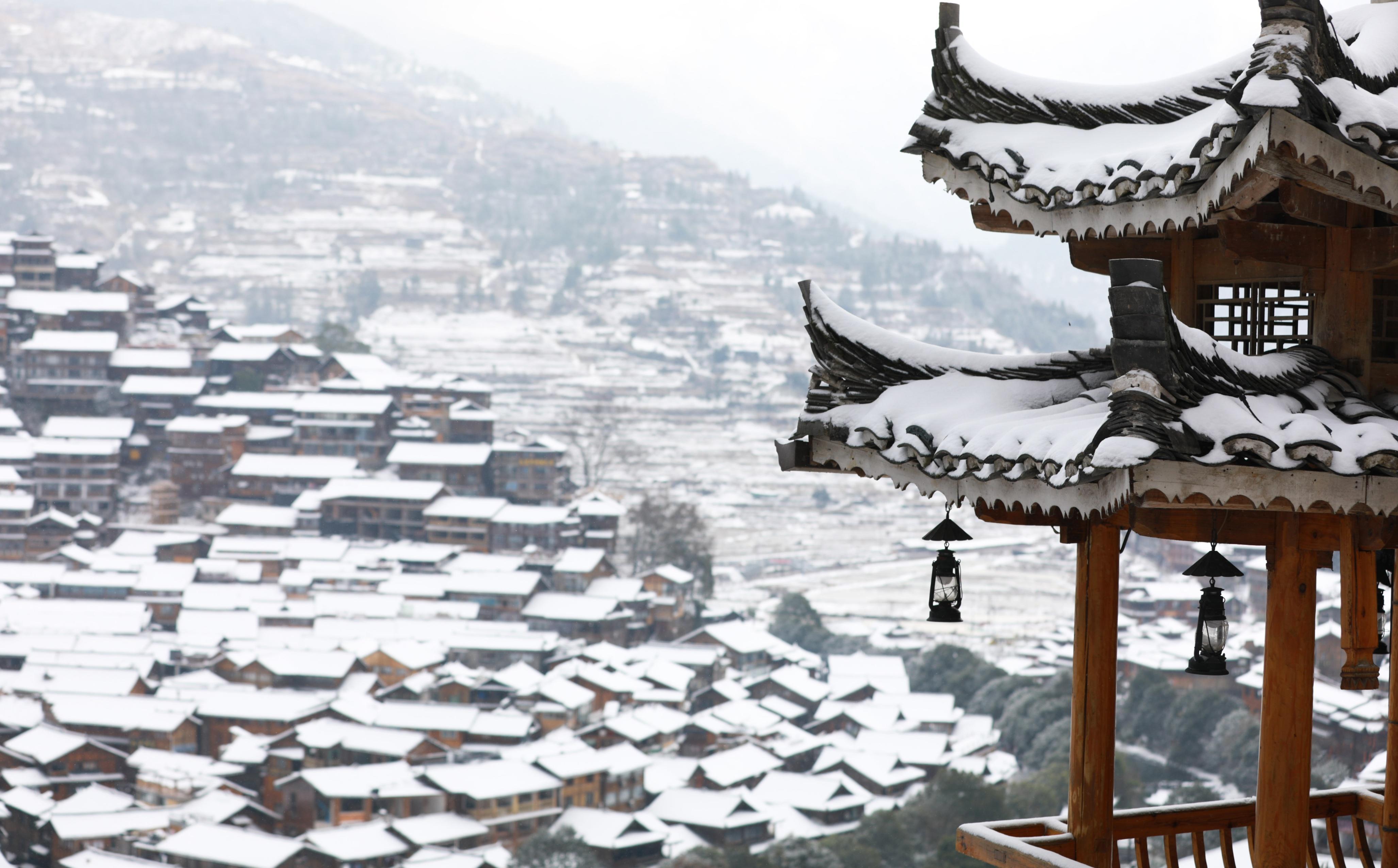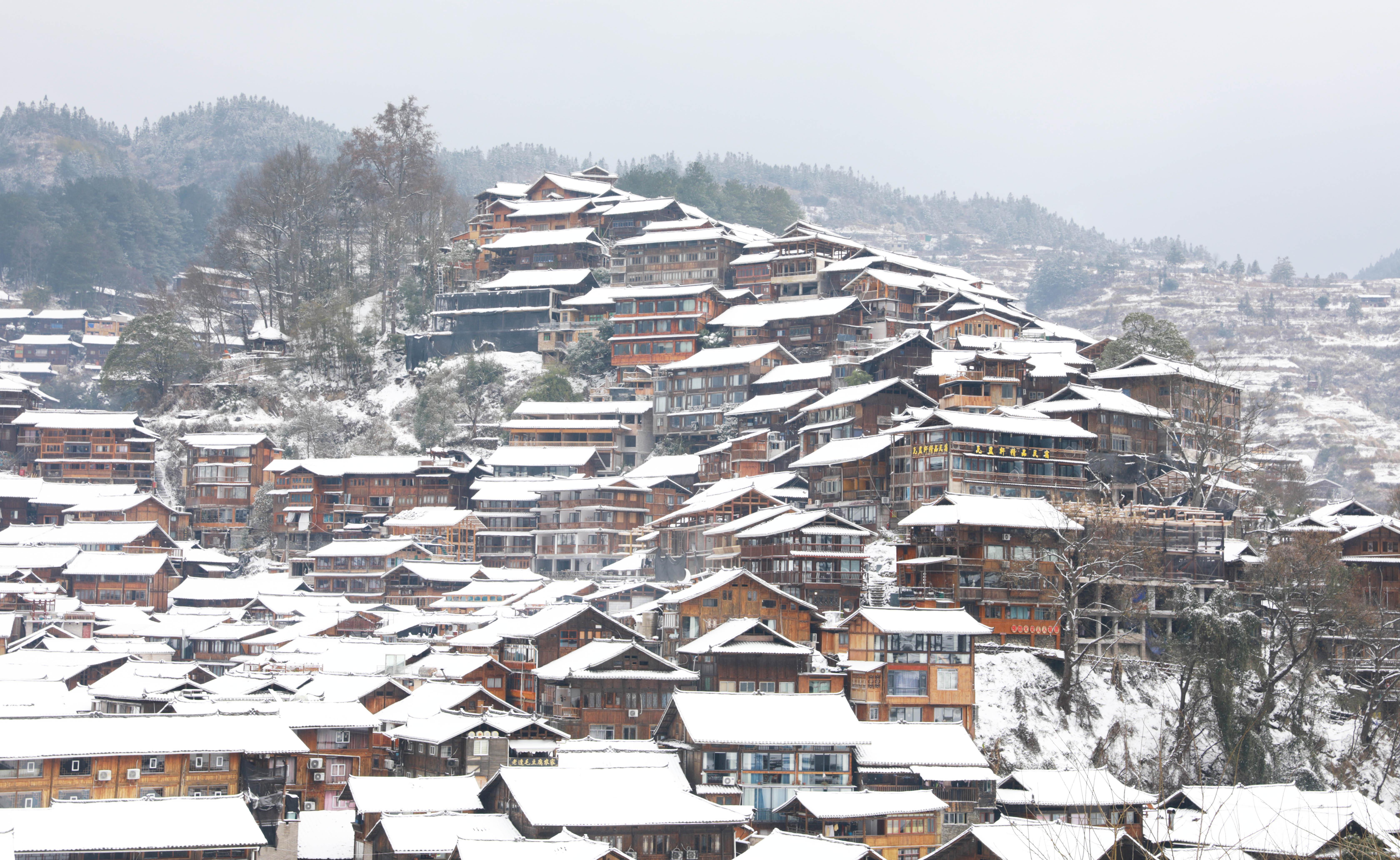 1月22日,貴州省黔東南苗族侗族自治州雷山縣西江千戶苗寨迎來2024年第一場雪。一夜之間,西江千戶苗寨披上“銀裝”,掛滿白雪,獨特的苗寨雪景,吸引不少遊客觀賞。