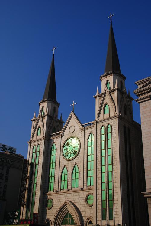 耶穌聖心主教座堂,一座宏偉的歐洲中世紀哥特式建築,尖頂上的兩個十字架,直插雲霄。