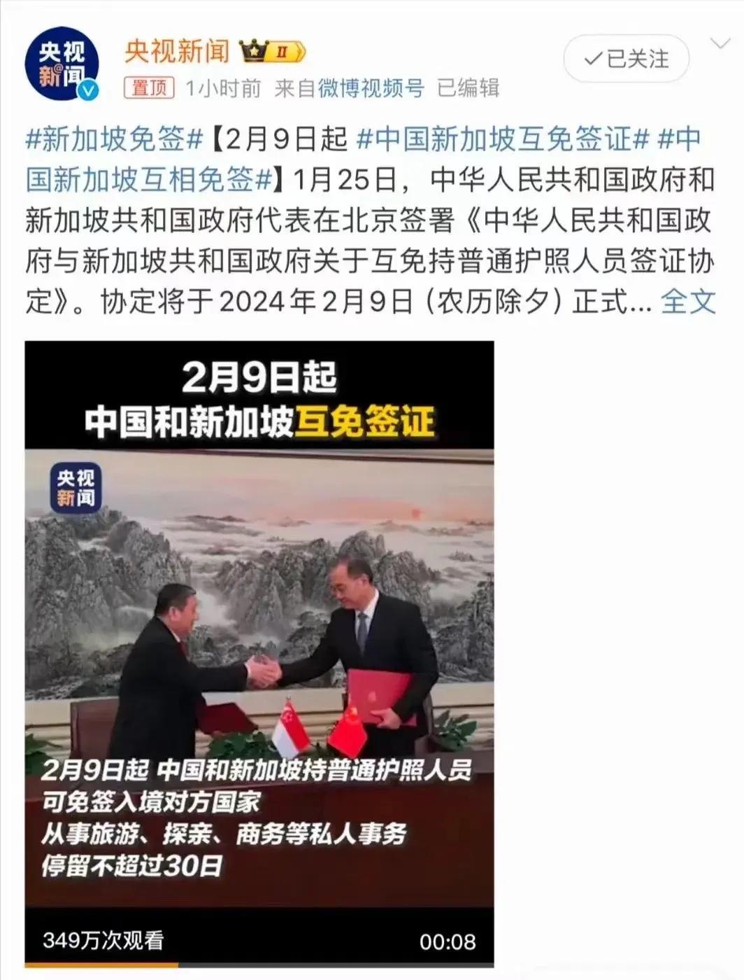 好消息來了2024年1月25日,中華人民共和國政府和新加坡共和國政府代表在北京簽署《中華人民共和國政府與新加坡共和國政府關於互免持普通護照人員簽證協定》。協定將於2024年2月9日(農曆除夕)正式生效。屆時,雙方持普通護照人員可免簽入境對方國家從事旅遊、探親、商務等私人事務,停留不超過30日。入境對方國家從事工作、新聞報道等須事先批准的活動以及擬在對方國家停留超過30日的,須在入境對方國家前辦妥相應簽證。