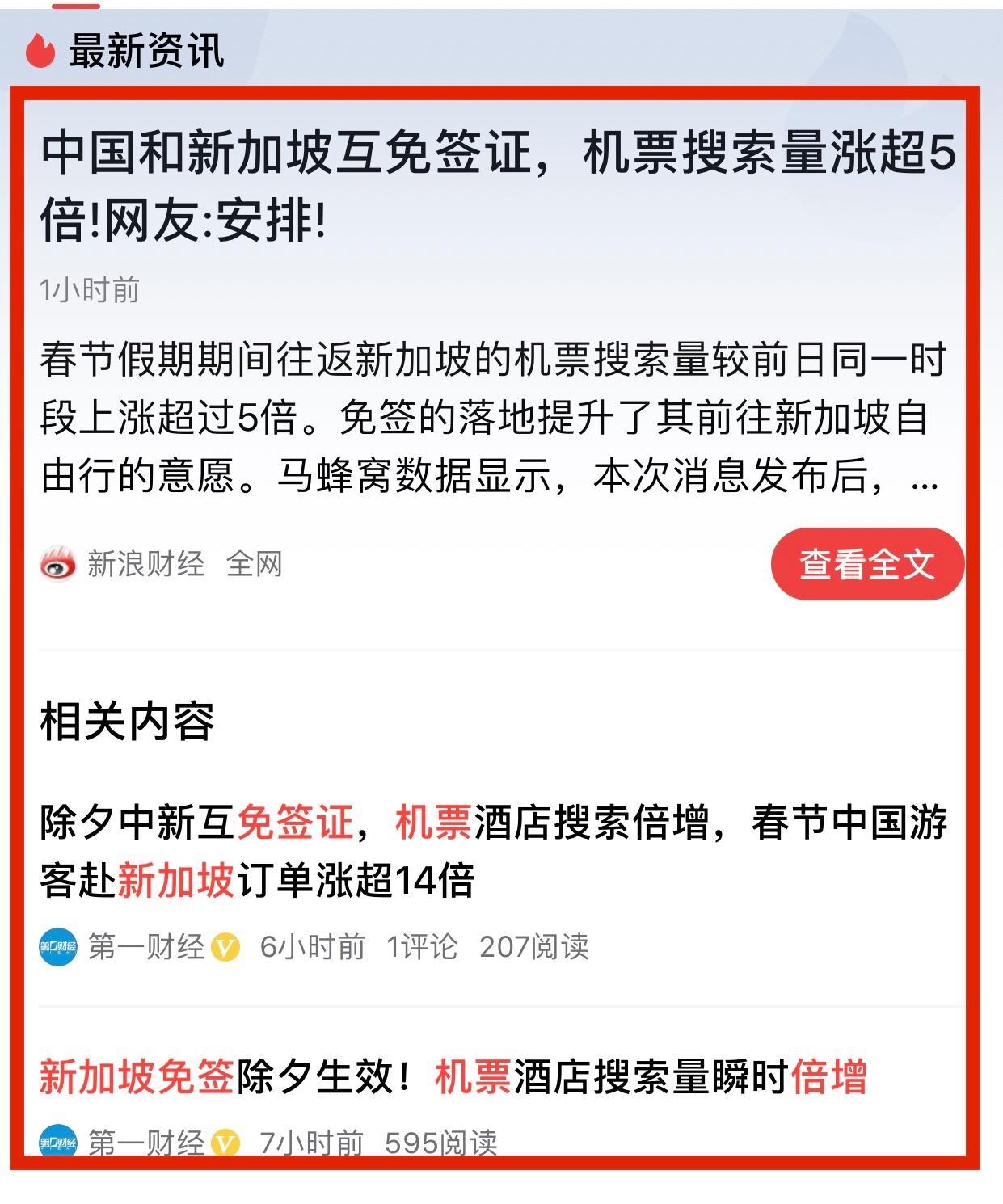 消息公佈後,去哪兒數據顯示,新加坡機票、酒店搜索量均有增長,其中新加坡酒店搜索量較發佈前增長四倍,機票搜索漲三倍。