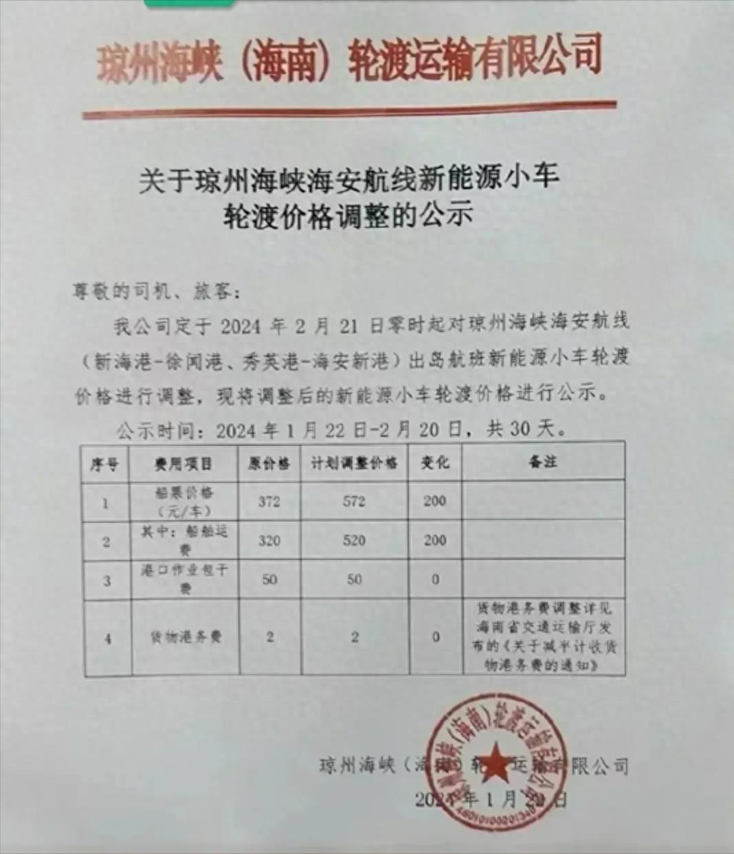 海南輪渡費用上漲!電動車進島玩沒那麼爽了,看網友怎麼說