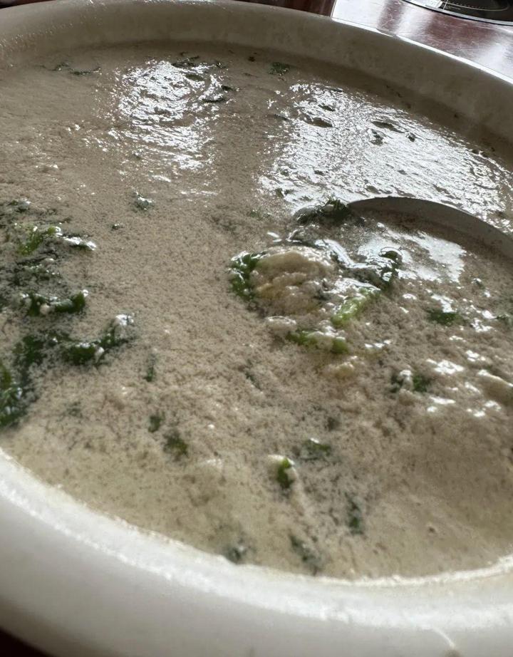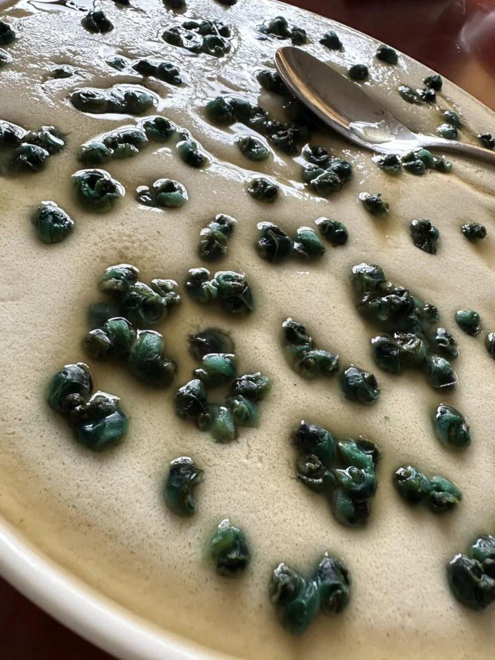 “巴馬三寶”是同行小夥伴唸叨最多的,一打聽,得知是香豬、油魚、火麻,此行有幸都喫到了。但最先給我留下記憶點的反倒是三寶之外的綠螺。當地朋友介紹,這是盤陽河特有的螺螄,是生活在盤陽河源頭的一種山坑螺,碧綠的螺肉與盤陽河水的顏色一樣。當地人常年摸綠螺做美食,綠螺煎蛋、綠螺粥等是常見的做法。我們喫的是綠螺蛋羹,點綴在蛋羹上的綠螺特別像碧螺春茶葉,喫了好久也沒嚐出來到底是什麼,還誤以爲是三寶之一的火麻。在我們“以謠傳謠”的交談聲中,還是當地朋友站出來“撥亂反正”,說這是當地特有的碧螺。