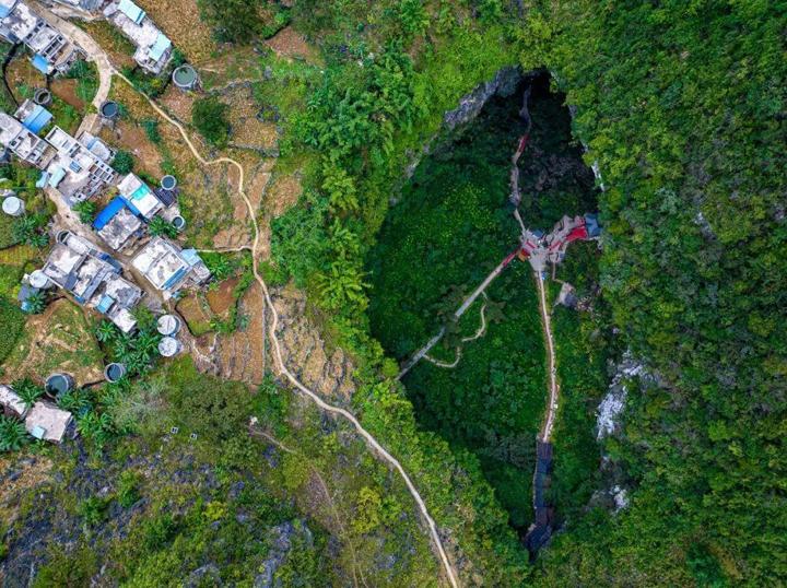 天坑左邊的山崖上有一處村寨。在百魔洞遊玩時,常看到不少老人沿着一條曲折的石梯小路順山崖而上,百魔洞正是他們回家的必經之路。我們去的那天,就遇到一位99歲的老人,正健步如飛地穿過洞穴返回山上的瑤寨,不時有遊客拉着她合影留念,還有人拉着她興奮地說三年前就見過她。我在擁擠的人羣中能看出老人雖然着急回家,但是又儘量配合熱情遊客們而略顯侷促,這大概就是她每天的日常,只要出門或者回家,就一定會遇到類似的“熱情”。百魔洞偶遇的這位老人,讓我直觀體會到巴馬爲什麼是中國第一個被國際、國內雙認定爲“世界長壽之鄉”和“中國長壽之鄉”的縣份。