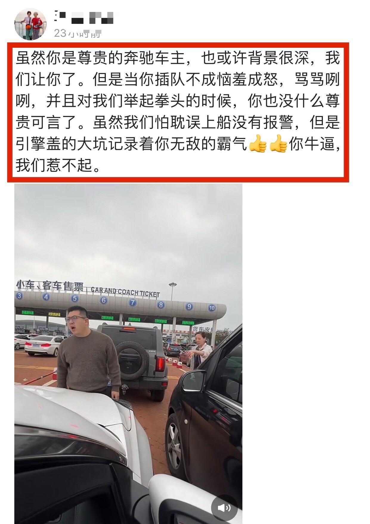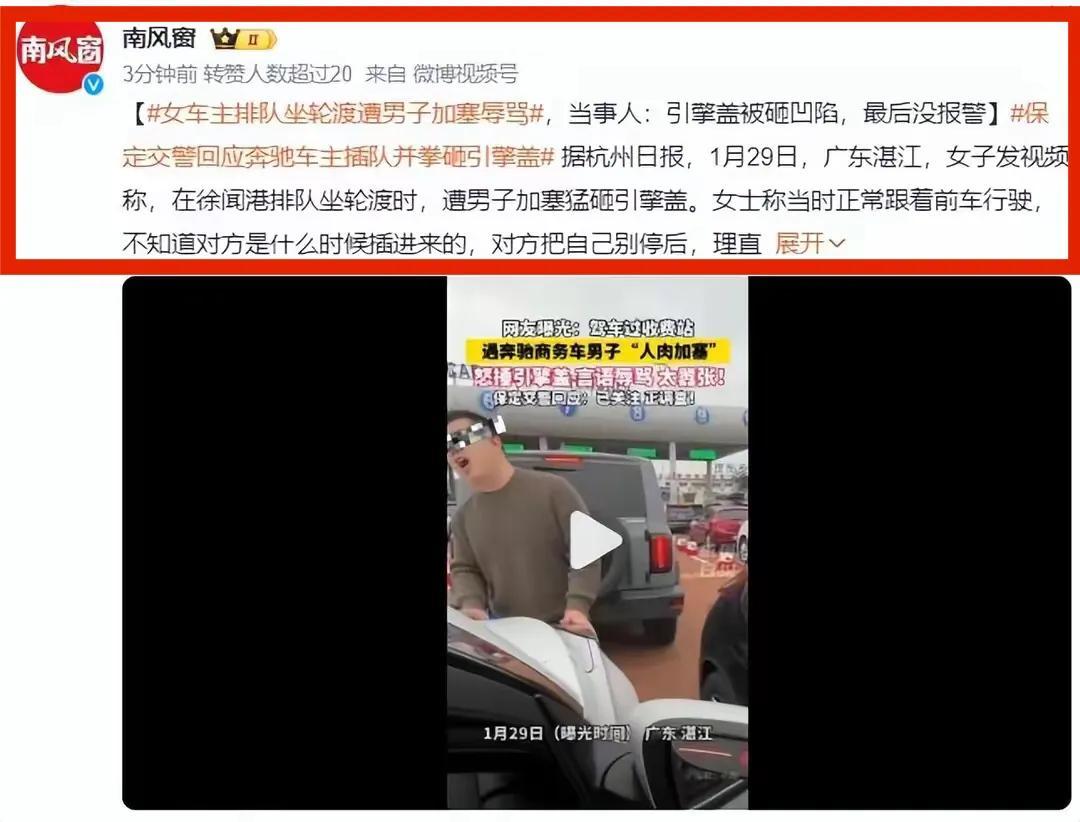 湛江徐聞海口在春運纔開啓第五天,每天自駕遊過海的車隊已經拍成長龍,爲了能第一時間上船,很多自駕遊車主就不守規矩,違規駕駛,根據旅遊熱榜消息,2024年1月29日,河北一輛奔馳牌照車輛在湛江徐聞輪渡過海時,不按規矩行駛,加塞山東日照女車主別停對方,下車辱罵山東日照女車主對一家人老人孩子造成了心理、情緒傷害,河北奔馳車主還舉起拳頭怒砸女車主引擎蓋,引擎蓋已經砸下了一個很大凹糟。