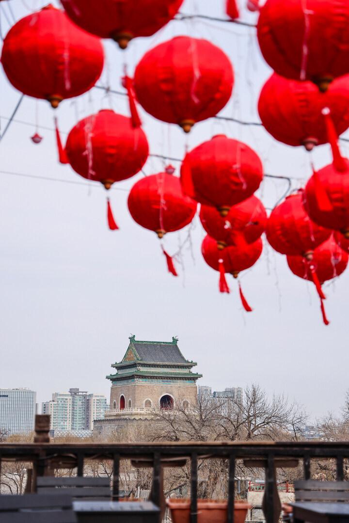 1月30日,北京什剎海糖房咖啡店觀景臺掛上了大紅燈籠,渲染了濃濃年味。站在觀景臺上遠望,遊客可看到不遠處的鐘樓。記者 曹雪文 攝