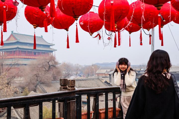 1月30日,北京什剎海糖房咖啡店觀景臺掛上了大紅燈籠,吸引了不少遊客前來喝咖啡、觀賞。圖爲遊客在觀景臺與不遠處的鼓樓合影。記者 曹雪文 攝