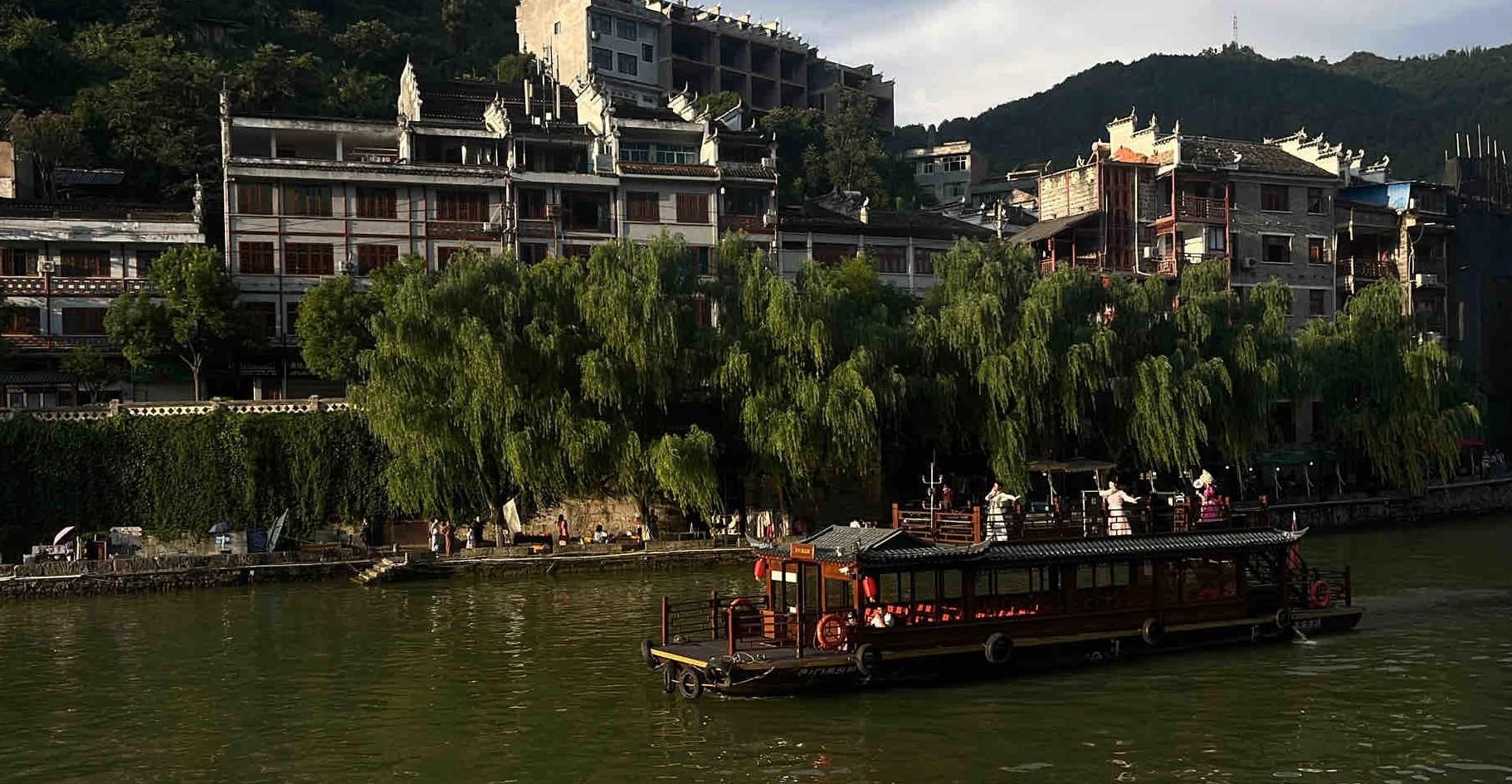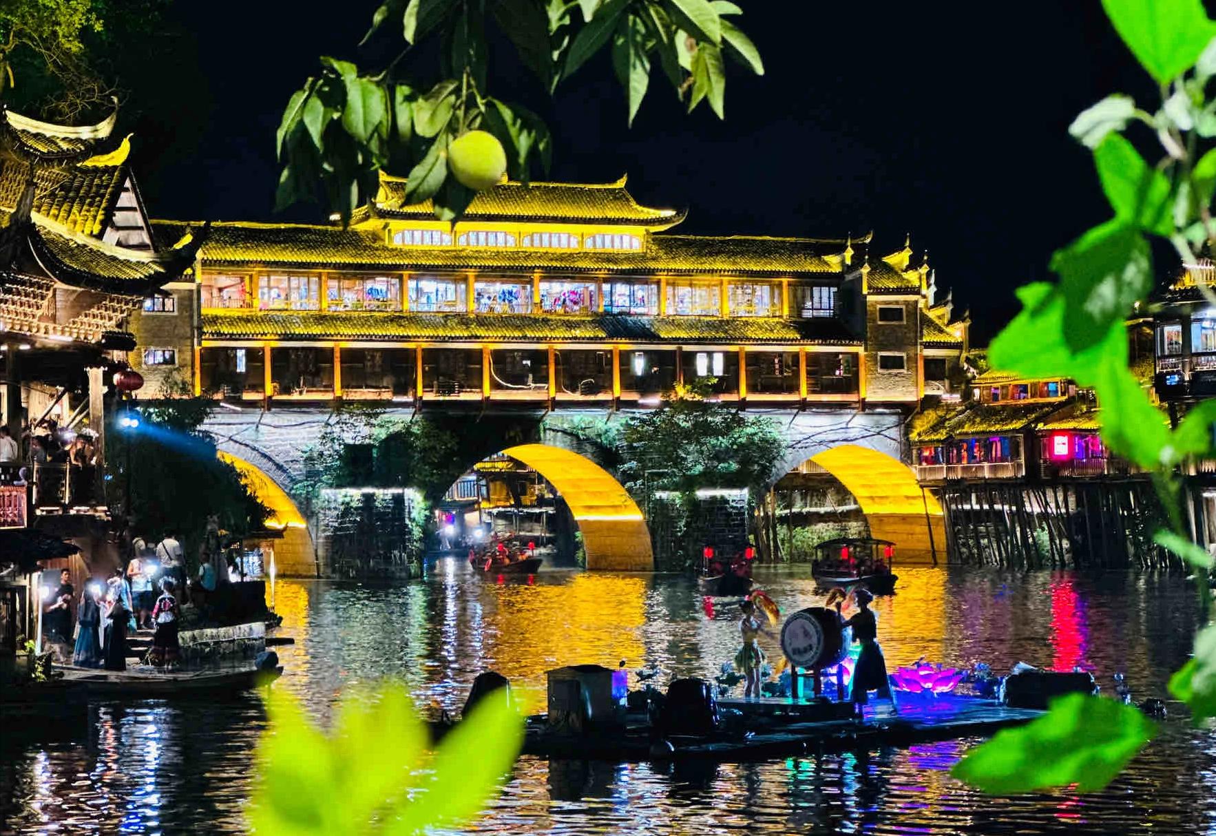 乘坐沱江上的遊船,在清澈的河水中盪漾,聽着來往船上湘西妹子的歌聲,看着兩岸已有百年曆史的土家吊腳樓,別有一番韻味。(沱江遊船票可在友艇小程序購買)