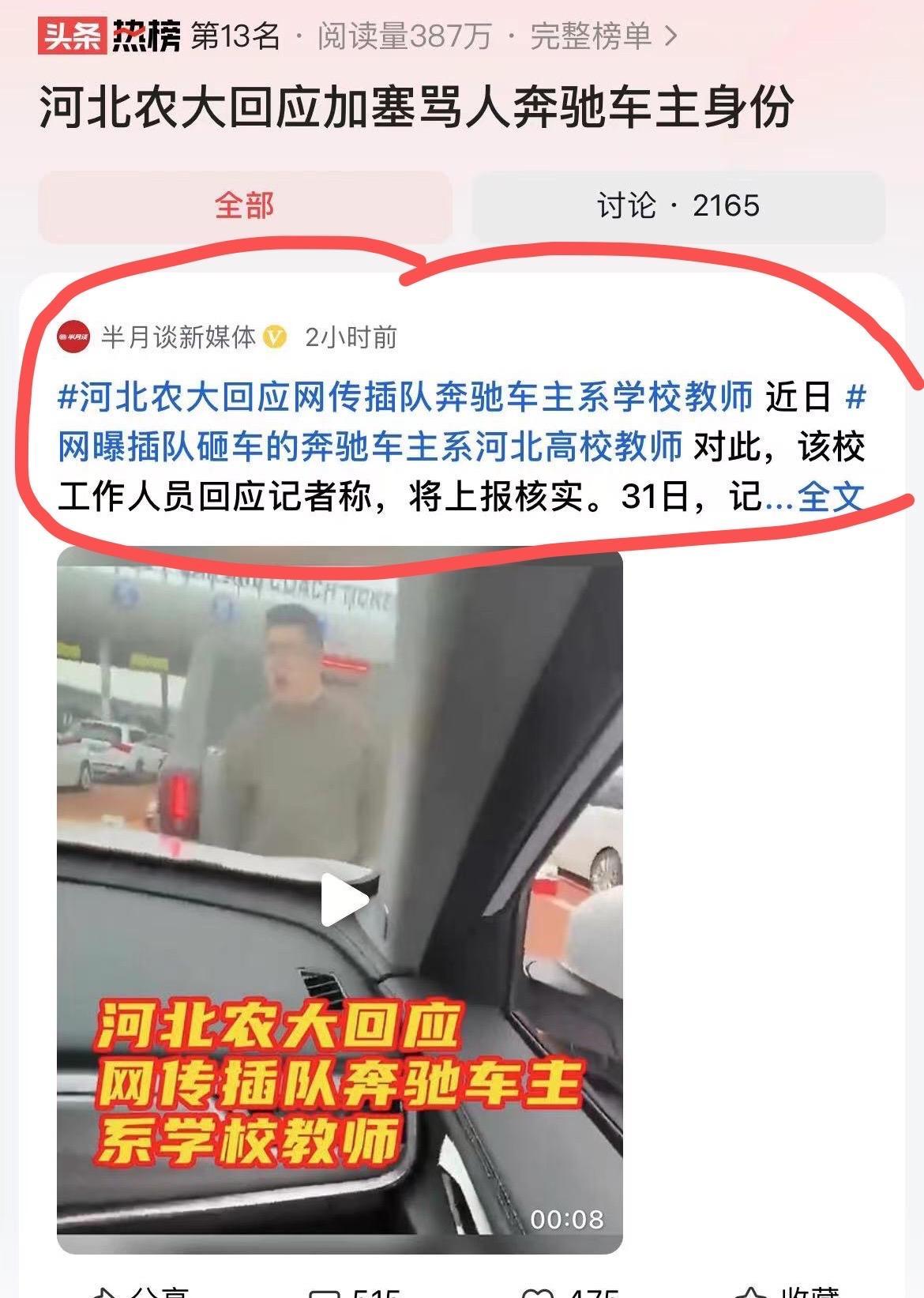 河北保定奔馳車主被處罰之後,網友扒出奔馳車主男子是河北農業大學老師,官方賬號被攻陷,河北農業大學給出了回覆,目前學校放假了,暫時無法覈實男子是否爲本校老師,會把情況上報學校有關部門,查明真相會向社會公佈。