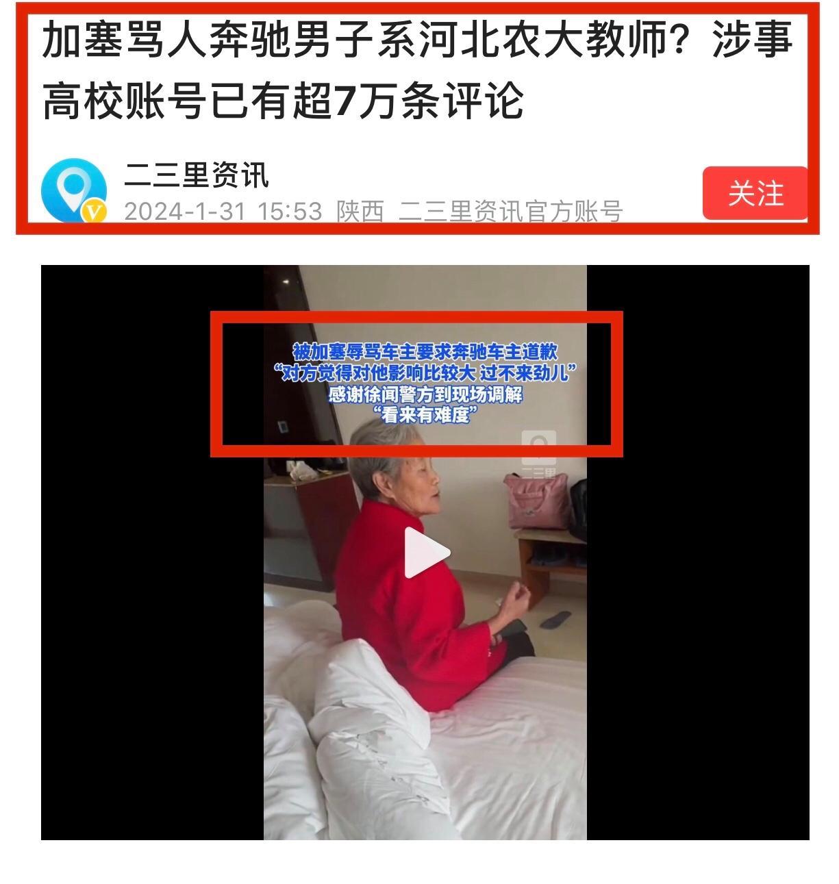 一個40歲的男人,據說網傳是大學老師,如果真是老師,他的學生犯點什麼錯,按照他罵人砸車性感邏輯方式,他是不是要把學生掐死,要把學生祖宗十八代罵過遍,這樣老師怎麼教書育人,顯然德不配位。(現在奔馳車主是不是大學老師待定,要等河北農業大學證實,但是他戴着一副眼鏡,看起來很有文化素養的人),還說別人激怒他,被人套路,你自己沒有獨立思考能力嗎?分不清是非嗎,不知道報交警處理嗎、如果老太太一家人真的別車搶到,報警作爲交通違法處置,爲何要上去辱罵人家,砸人家車,人品何在。