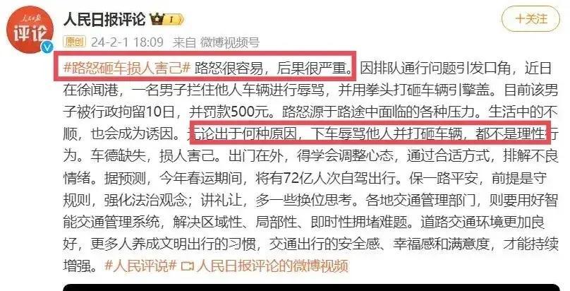 人民日報在2024年2月1日,晚間點評了奔馳車主加塞事情:無論出於何種原因,下車辱罵他人並打砸車輛,都不是理性爲。車德缺失,損人害己。出門在外,得學會調整心態,通過合適方式,排解不良情緒。據預測,今年春運期間,將有72億人次自駕出行。保一路平安,前提是守規則,強化法治觀念;講禮讓,多一些換位思考。