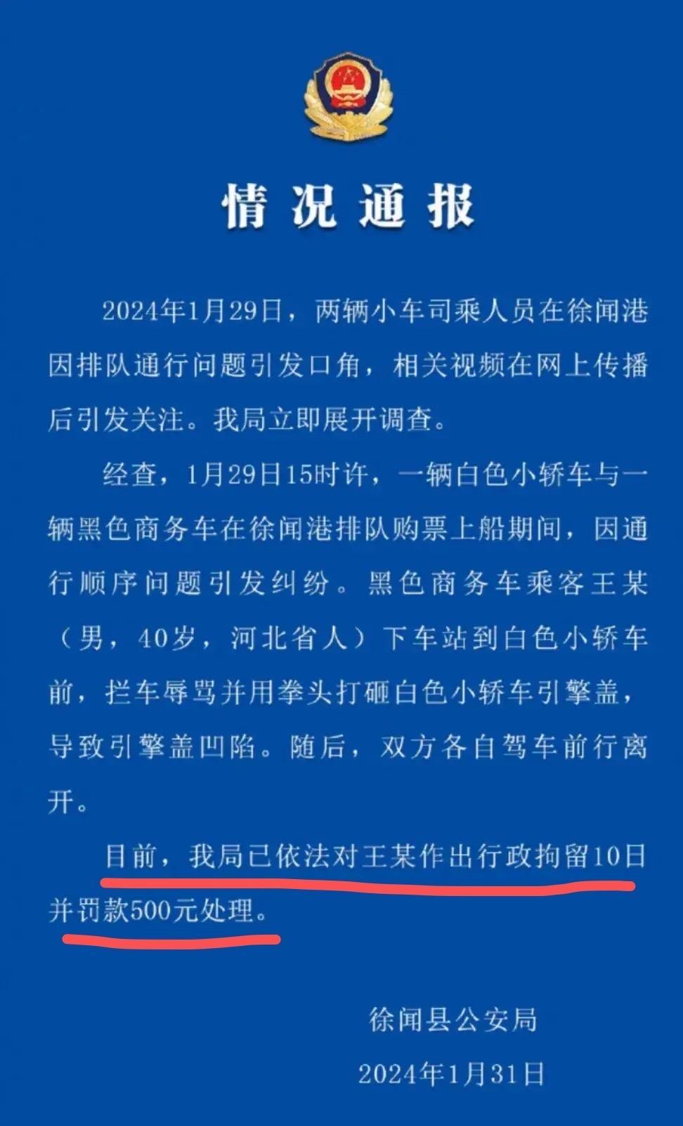 事情衝上旅遊熱搜榜之後,全網鬧得沸沸揚揚,河北文旅官方賬號和河北農業大學賬號評論區被攻陷,河北保定交警接到網友反饋,交給廣東湛江徐聞有關部門進行處理,1月31日,徐聞相關人員赴海口聯繫71歲奶奶和他女兒徐女士一家人,瞭解事情來龍去脈之後,最終定性處罰保定奔馳車主男子(王某)40歲,拘留10天,罰款500元,事情由此塵埃落定,71歲奶奶一家人自駕遊開的奇瑞汽車,奇瑞海口4s店特意爲71歲奶奶送來代步車,被砸車輛進行維修,並送上鮮花水果,祝福她們一家在海南度過愉快的春節假期。