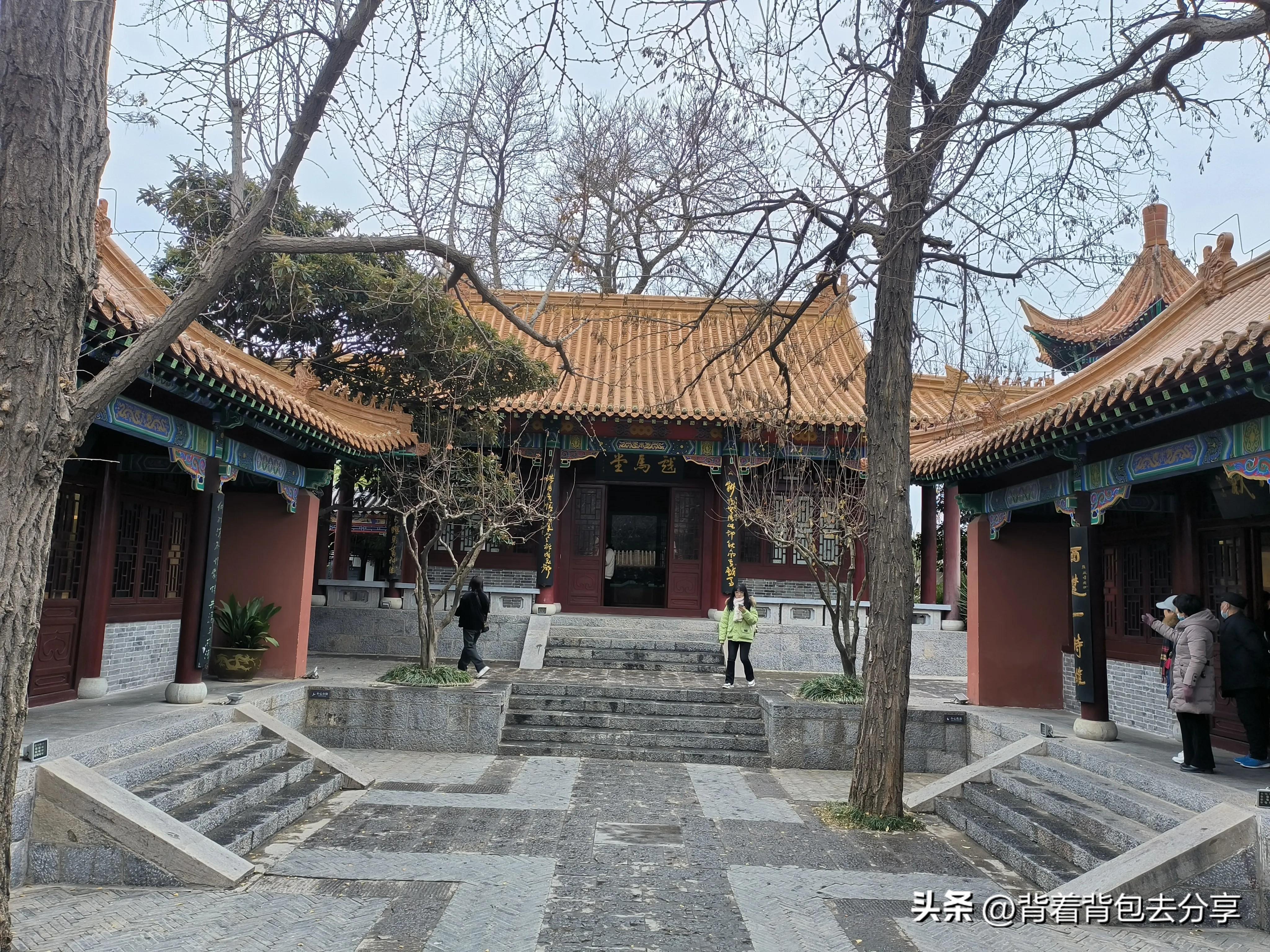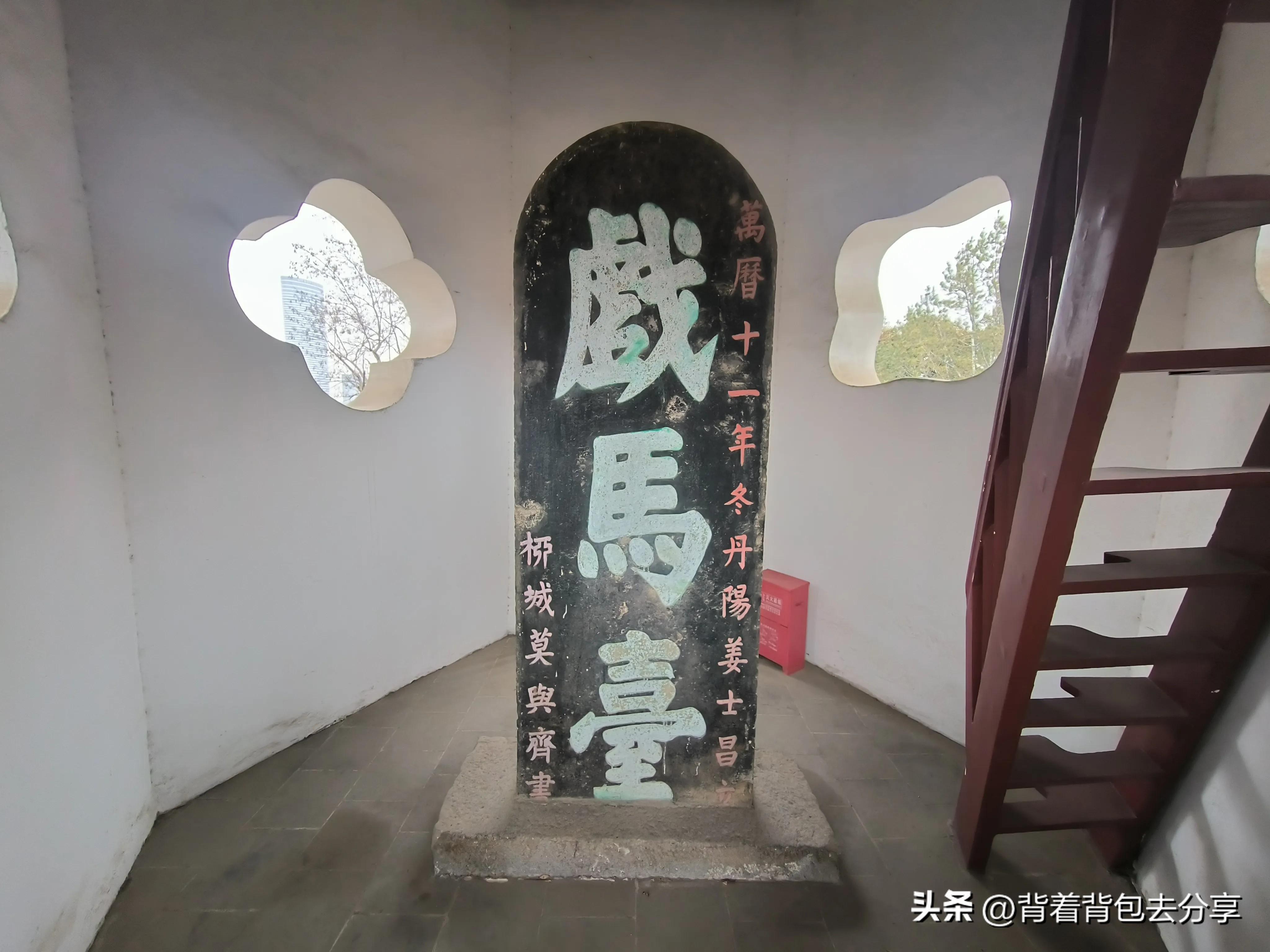 風雲閣,是戲馬臺景區標誌性建築,也是戶部山至高點,碑亭始建於清道光二十八年,按江南園林風格設計,雙層六角飛檐,南檐嵌有四字篆額從此風雲,亭內有明代石碑,爲明萬曆十一年,徐州戶部主事姜士昌所立,正面有柳城人莫與齊所書戲馬臺三字,字幅盈尺,古樸莊重,石碑背面刻有徐州重建儒學記,看過風雲閣,來到了戲馬堂,堂內有霸業雄風勝景圖,非常震撼