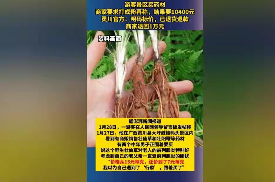 根據被宰遊客描述,他於2024年1月27日跟團遊靈川縣大圩鼓樓碼頭景區,在路邊看到商販售賣特產(壯仙草和壯陽鞭),他想到自己父親前列腺炎,準備買點這個特產,他先是看到兩個遊客大哥買了,對方說這個效果好,他就心動了,跟着買。