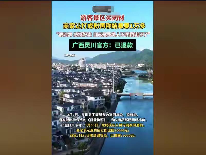 224年2月2日,靈川縣工商局辦公室回覆說,經覈查,商家能出示合法的《營業執照》,店內商品都已明碼標價,計量器具準確。1月30日,經局執法人員與商家溝通後,商家表示退貨後立即退回10000元。商家1月31日收到退貨後,已退回10000元。