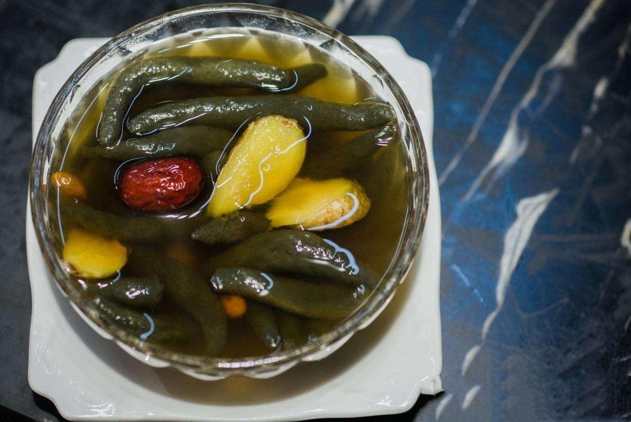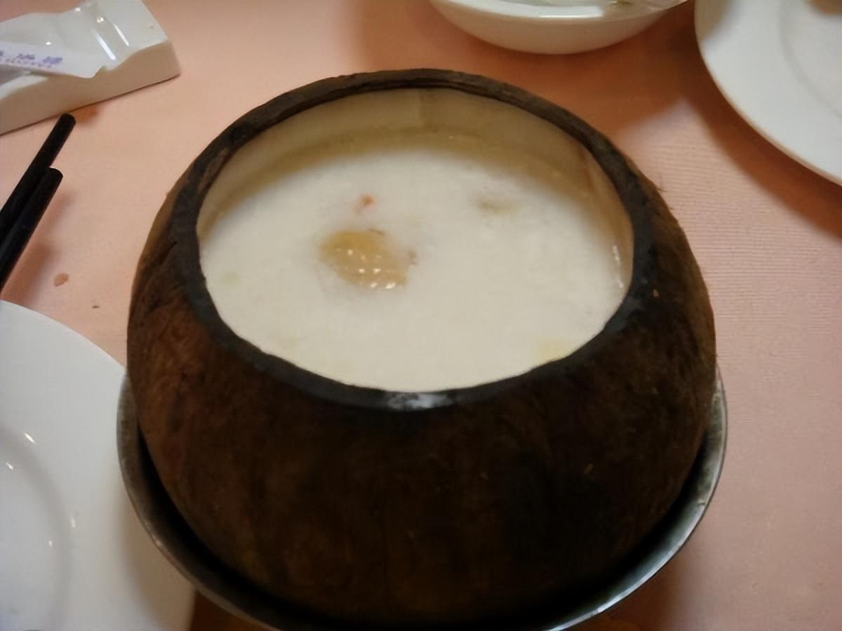 瓊州椰子盅,選用乳鴿爲主材,配以枸杞、人蔘、紅棗等滋補物,經過數小時的慢火燉制而成,湯液乳白,椰香撲鼻,口感潤滑。