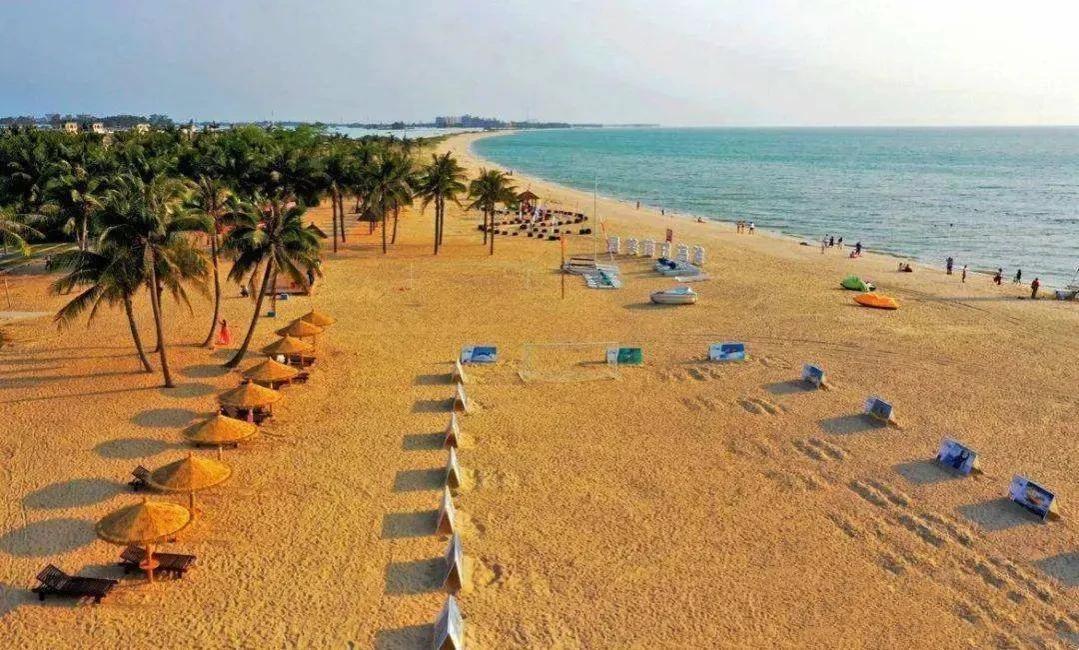 盈濱半島,北臨瓊州海峽,三面環海,形似彎月,岸邊沙灘廣闊、細軟無泥,海水碧藍澄澈,有內外雙海灣,還擁有稀缺的火山溫泉,是澄邁最美的灣區。