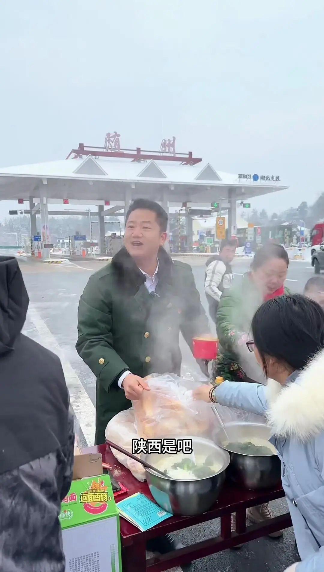 2月5日,福銀高速湖北隨州段因冰雪擁堵,大批車輛滯留。湖北省隨州市隨縣文化和旅遊局副局長舒明和十多名工作人員趕到收費站口,爲滯留旅客免費提供麪條、雞蛋等食物。