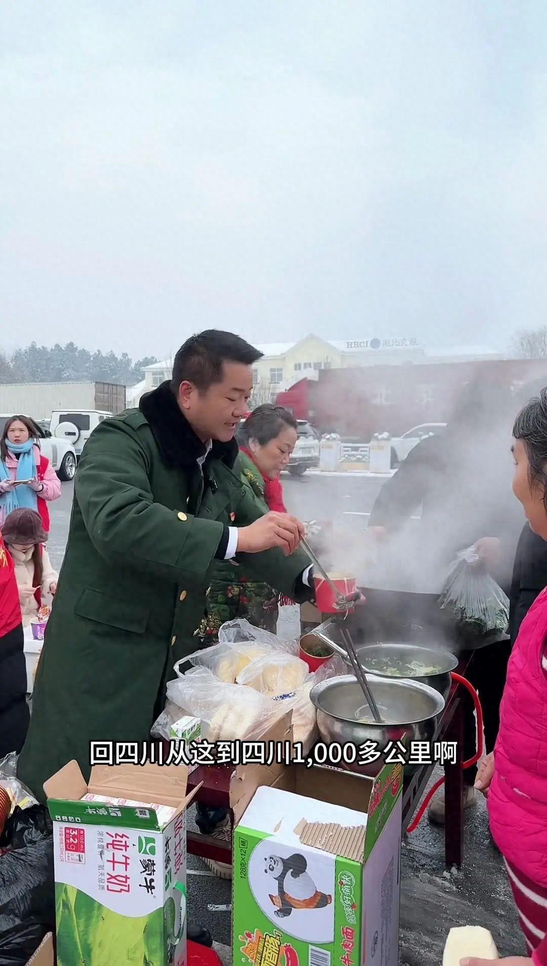 “準備完這些物資已經是2月5日凌晨兩點多鐘了。早上5點多我母親就起牀燒開水,燒了一個多小時,把這些水瓶全部裝滿熱水。7點鐘左右我們就把家裏的煤氣罐、鍋還有碗筷直接送到了G70福銀高速隨州收費站口。我們是從8點多開始發放食物的,考慮到滯留旅客可能比較多,我一個人忙不過來,我的母親、姨媽都去了現場,幫忙煮麪和維持秩序。”舒明說。