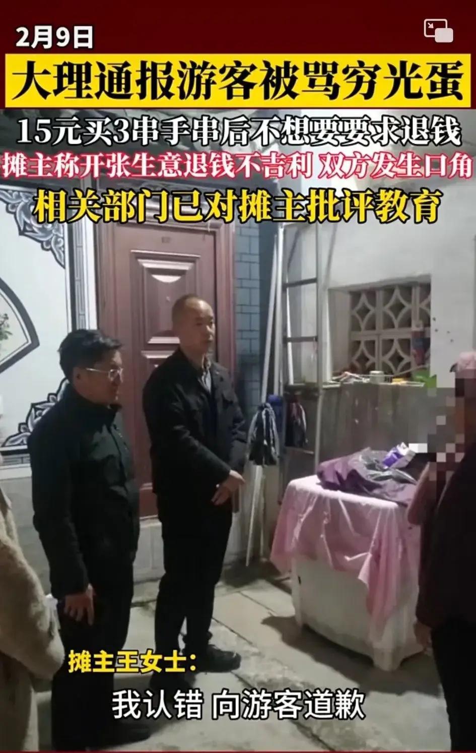 2月9日大理官方通告,事情真正原因是兩名女遊客看中了這位商販三個手串,談好價格5元一個,三個手串共15元,遊客付款完成後,又反悔了,要求攤主退款,攤主老闆娘認爲自己開張生意這種做法不好,與遊客協商退還2個手串10元錢,叫遊客購買一個,遭到遊客拒絕後,攤主老闆娘情緒激動就出口侮辱游客(窮光蛋),喜洲當地官方人員上門瞭解情況後,攤主老闆娘認知到自己錯誤,接受了官方的批評教育,攤主老闆娘現在想通過媒體道歉,尋求遊客原諒。