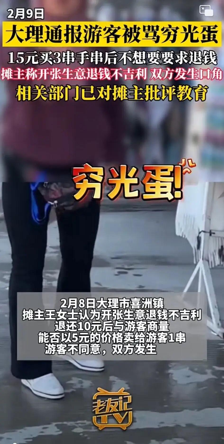 這個事情其實雙方都有一定過錯,大過年的誰都想討個好彩頭,結果雙方都不讓步,最終就鬧成不可收拾一幕,2名遊客遭遇言語攻擊,這趟旅遊肯定不開心,攤販被網暴,必定以後影響自己名聲和生意,其實大理喜洲現在不缺的就是遊客,不缺就是生意,攤主把錢退還遊客就了事,哪來這麼多節外生枝。