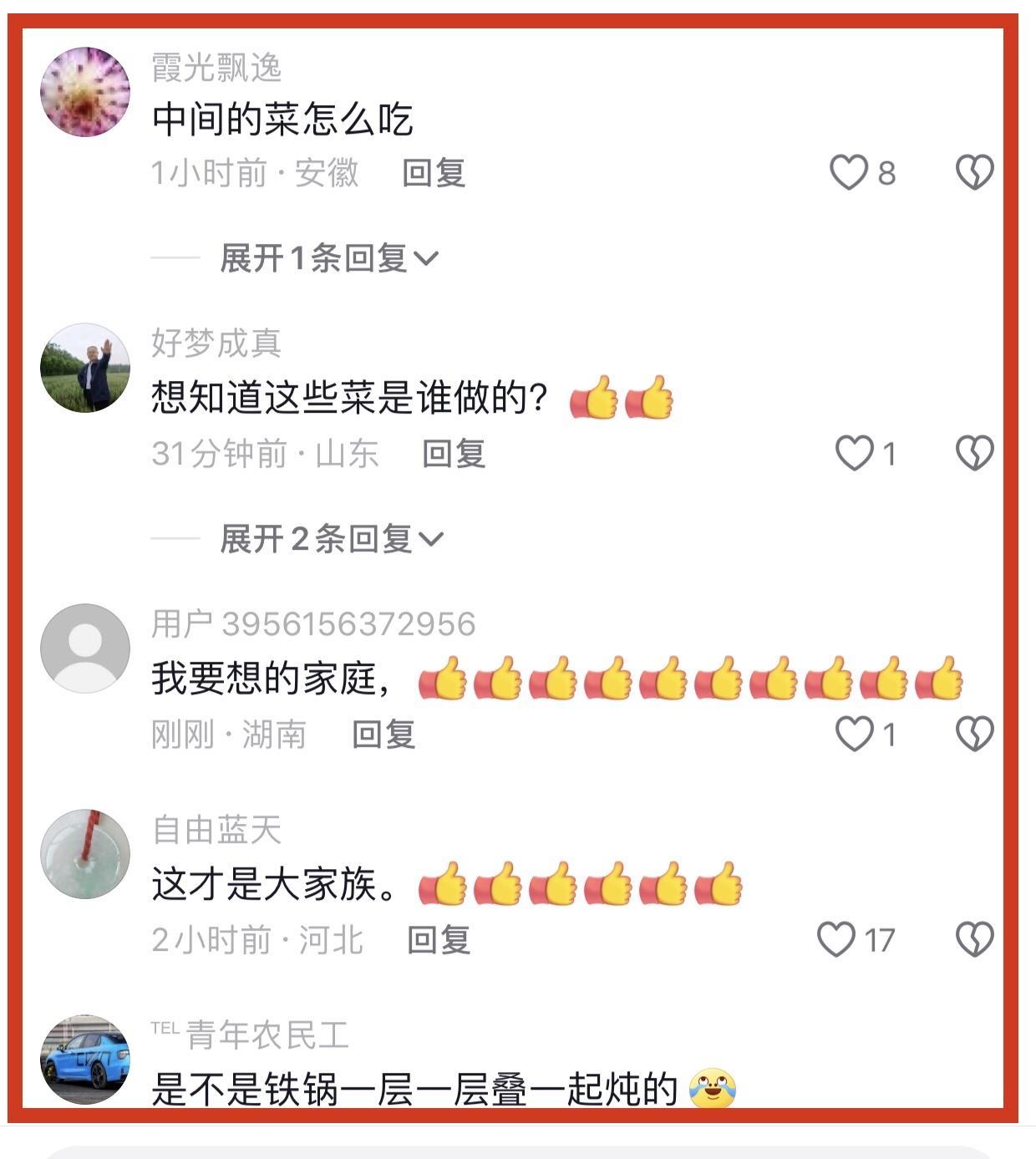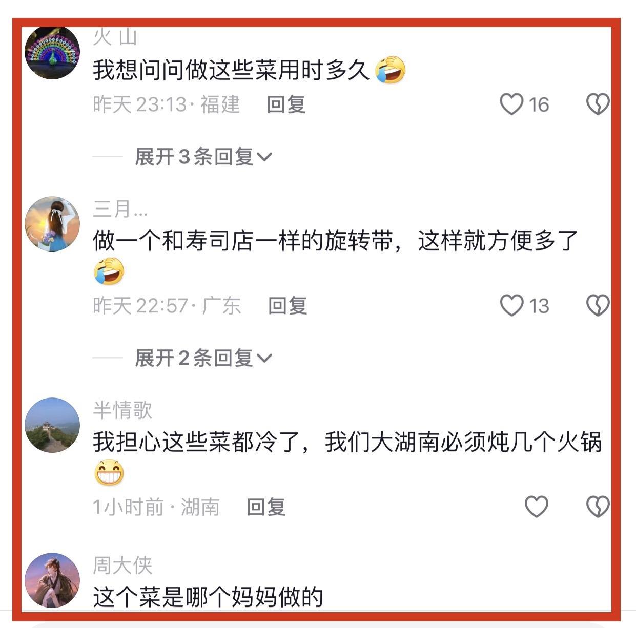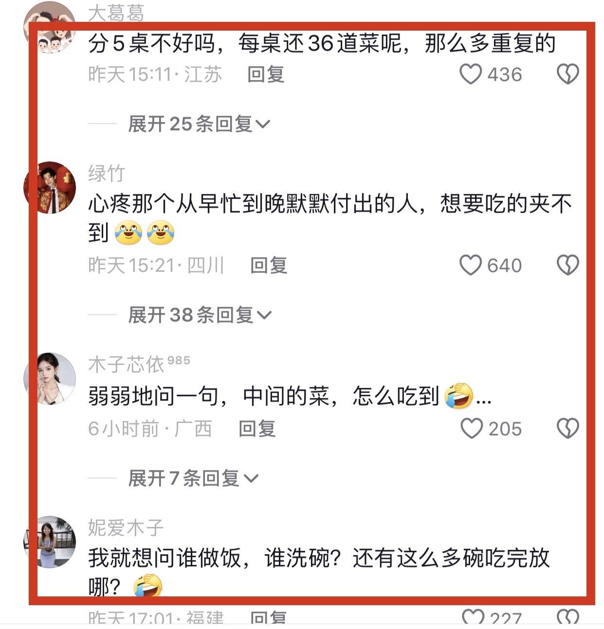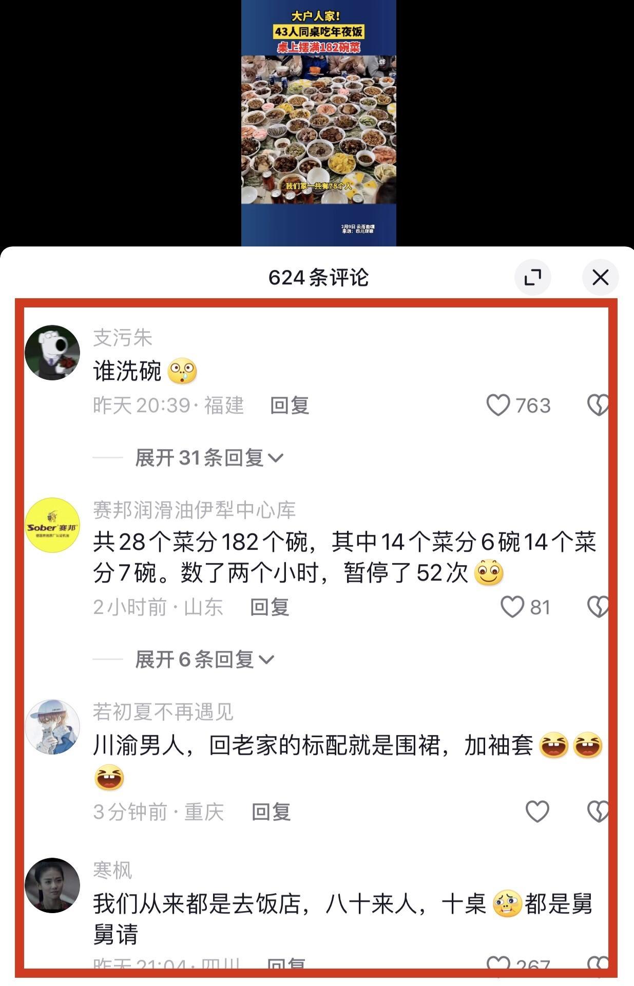 網友最想琢磨的是在中國還沒有找到這麼齊全菜品,網友們開始給這個大家庭年夜飯菜品算賬,也有網友擔心廚師太累。