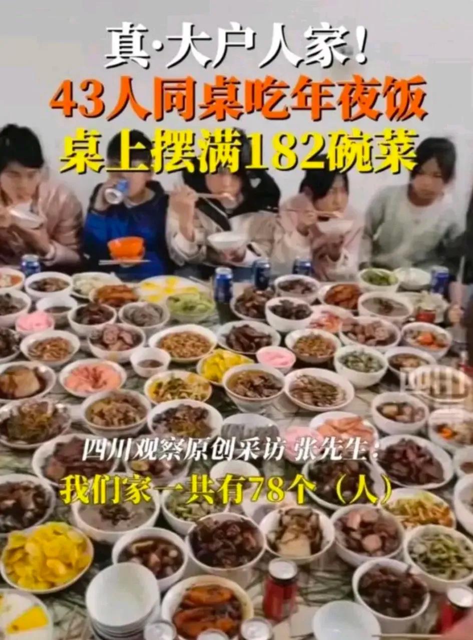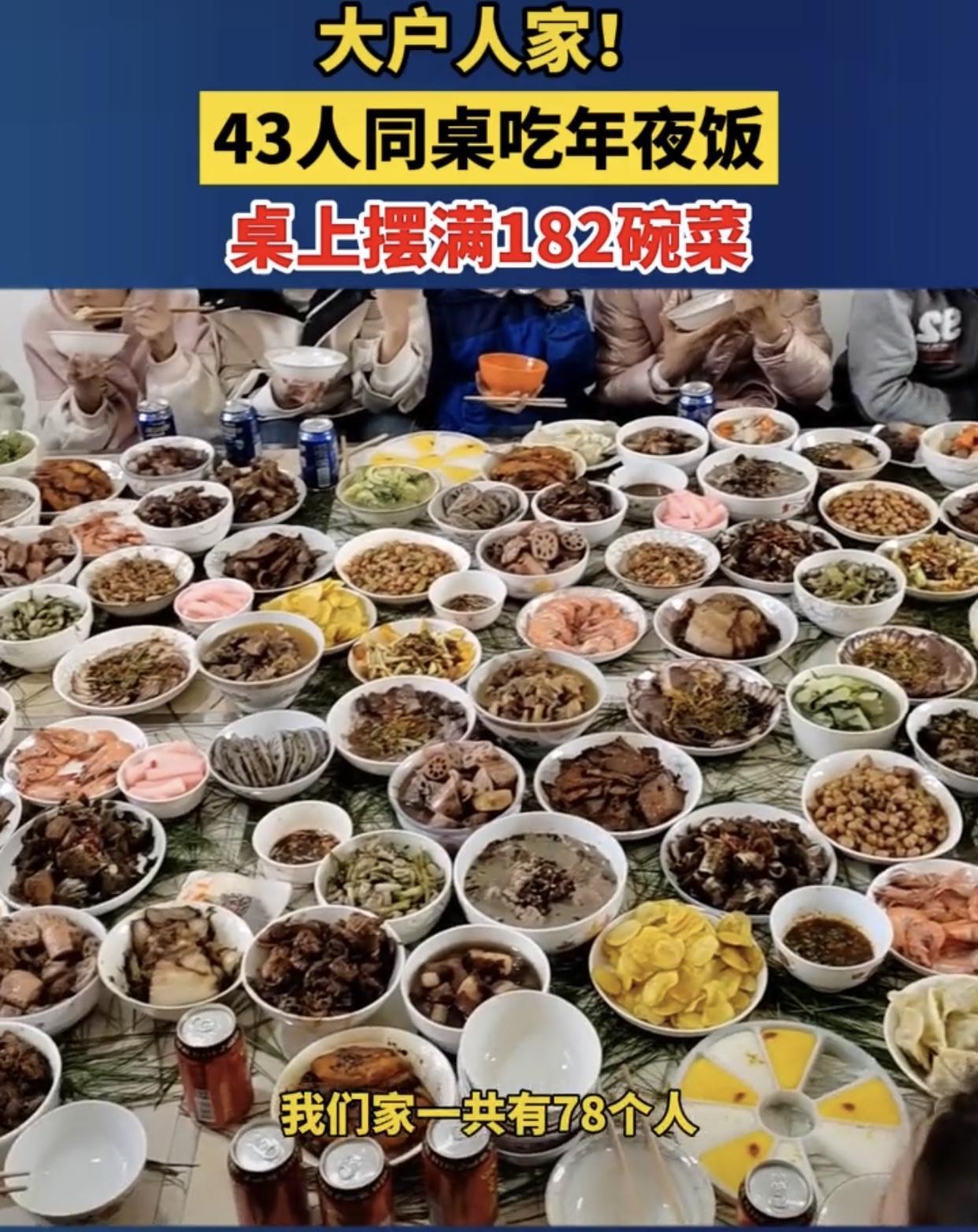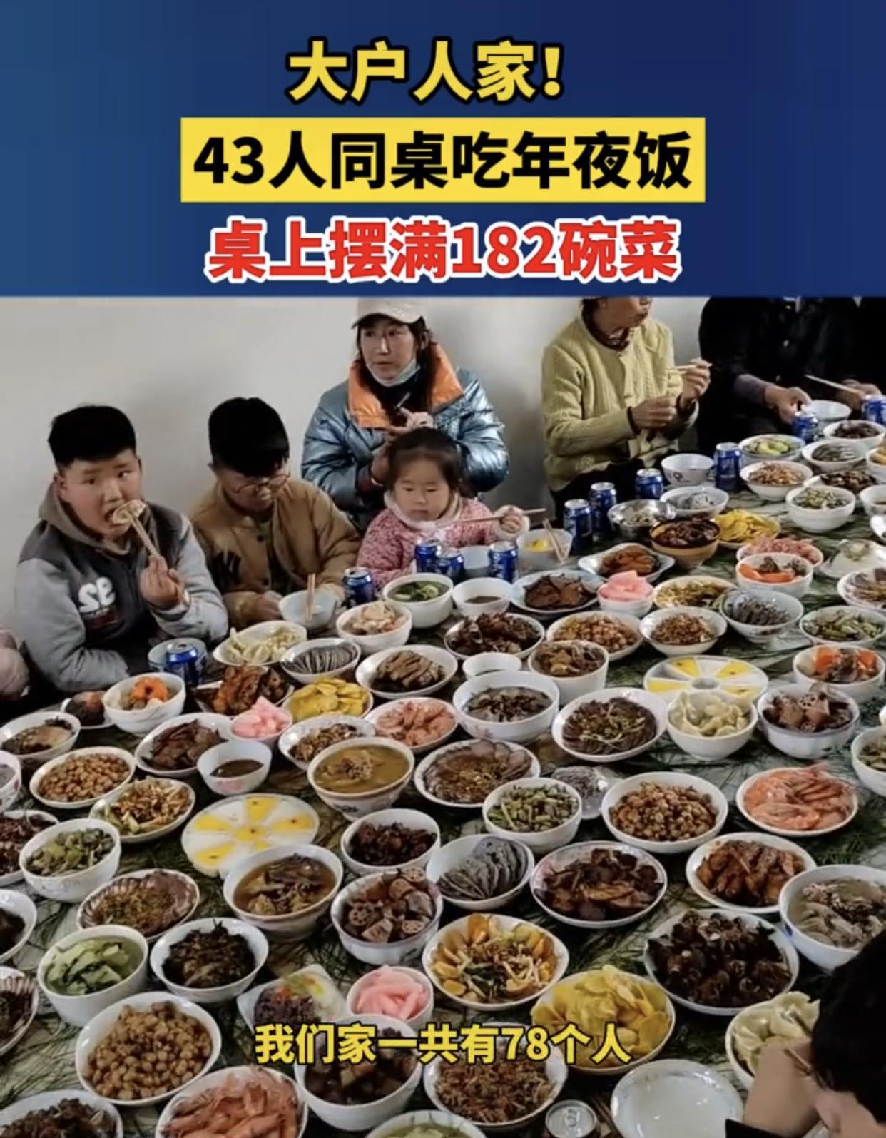 如今年夜飯越來越受到重視,2024年春節前除夕年夜飯,雲南曲靖一家人登上全網熱門,據當事人講述,他們家一共有78人,今年回家團聚的有43人,這桌年夜飯一共有182碗菜,中間的菜必須站起來才能夾得到,看得網友眼花繚亂的美食,整個菜品琳琅滿目,有山珍海味也有蔬菜素食,網友直呼堪比滿漢全席,老少圍桌坐一起喫團圓飯,氛圍感十足真是讓人羨慕的大戶人家,現在還能找到這麼一大家子一起喫團圓飯,真是少之又少。