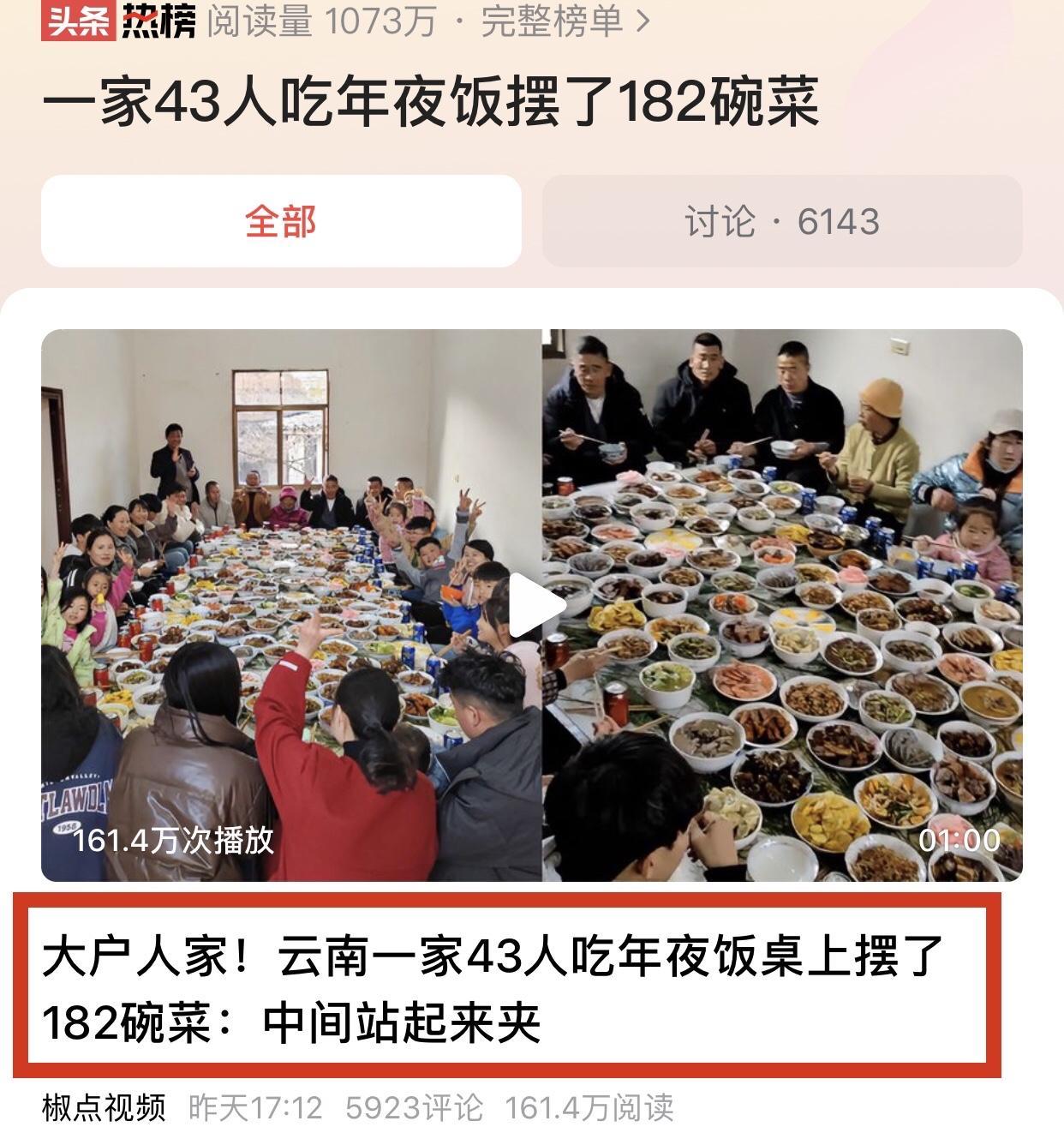 雲南曲靖一家43人春節喫年夜飯,擺182個菜:網友擔心累壞廚師
