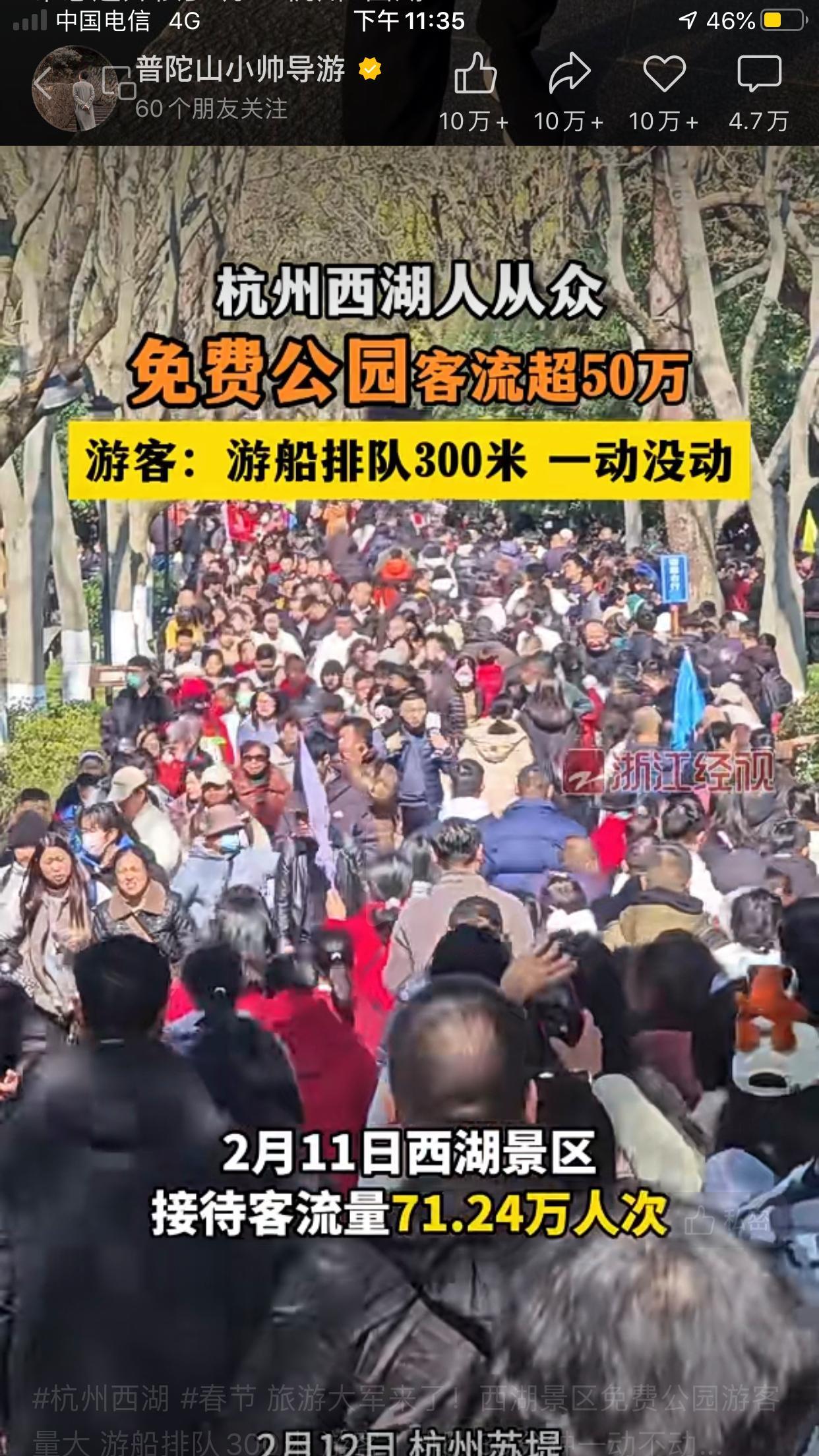 6、杭州西湖,2月11日西湖遊客就人從衆,接待遊客超71萬人次,遊船排隊300米,杭州西湖遊客爲什麼這麼多,主要是免費5A景區,這也是杭州西湖率先走在全國試點前例,從2002年免費以來,每年給杭州帶來很多積極性旅遊收入,住宿餐飲等方面成績顯著。