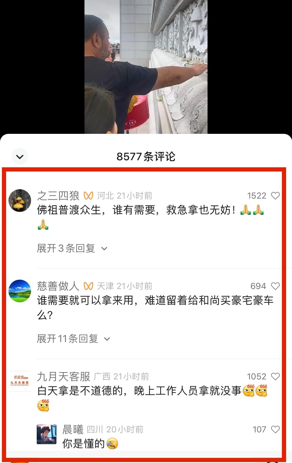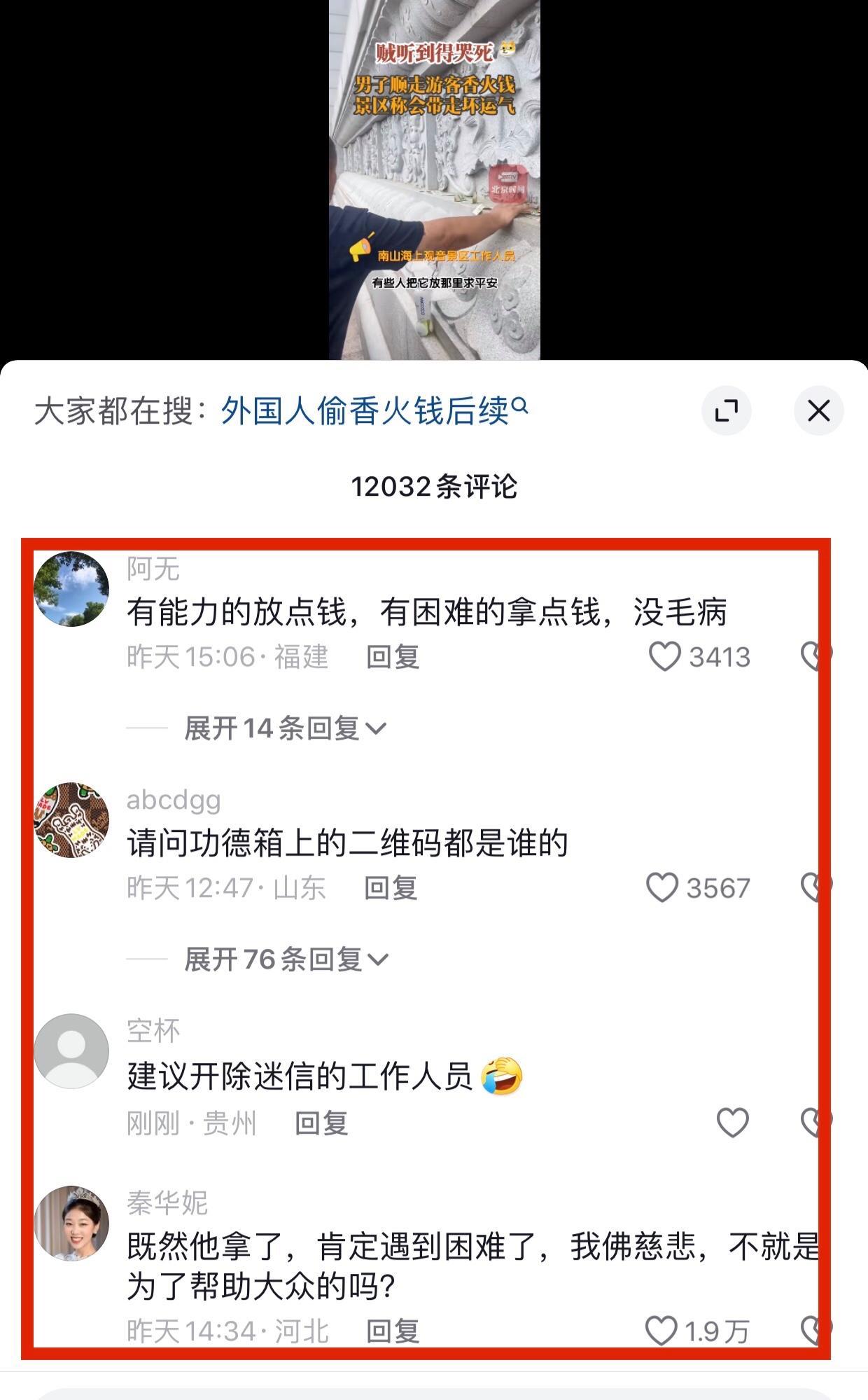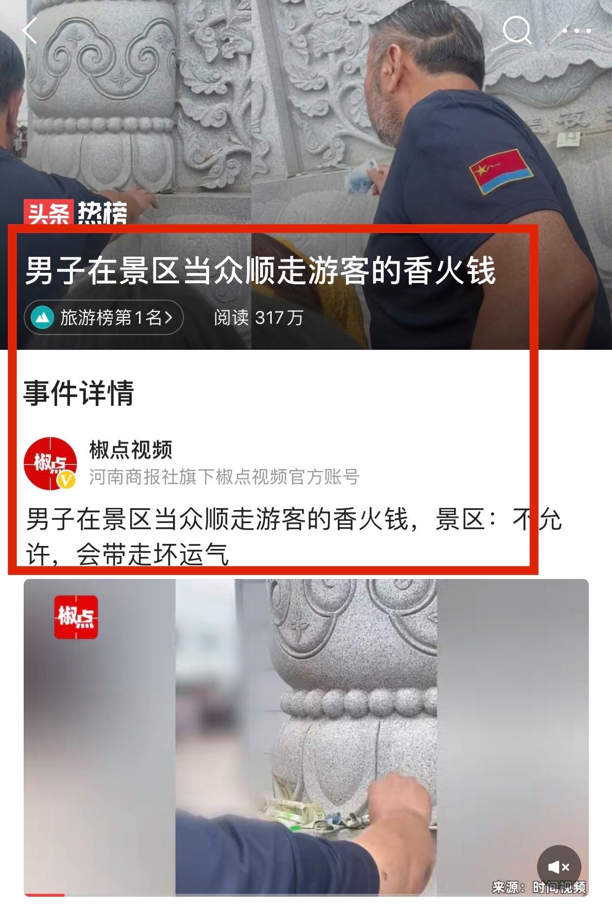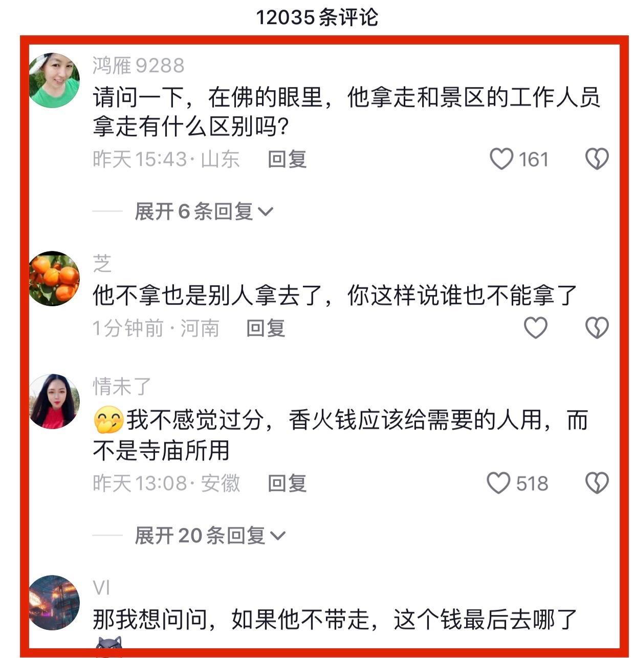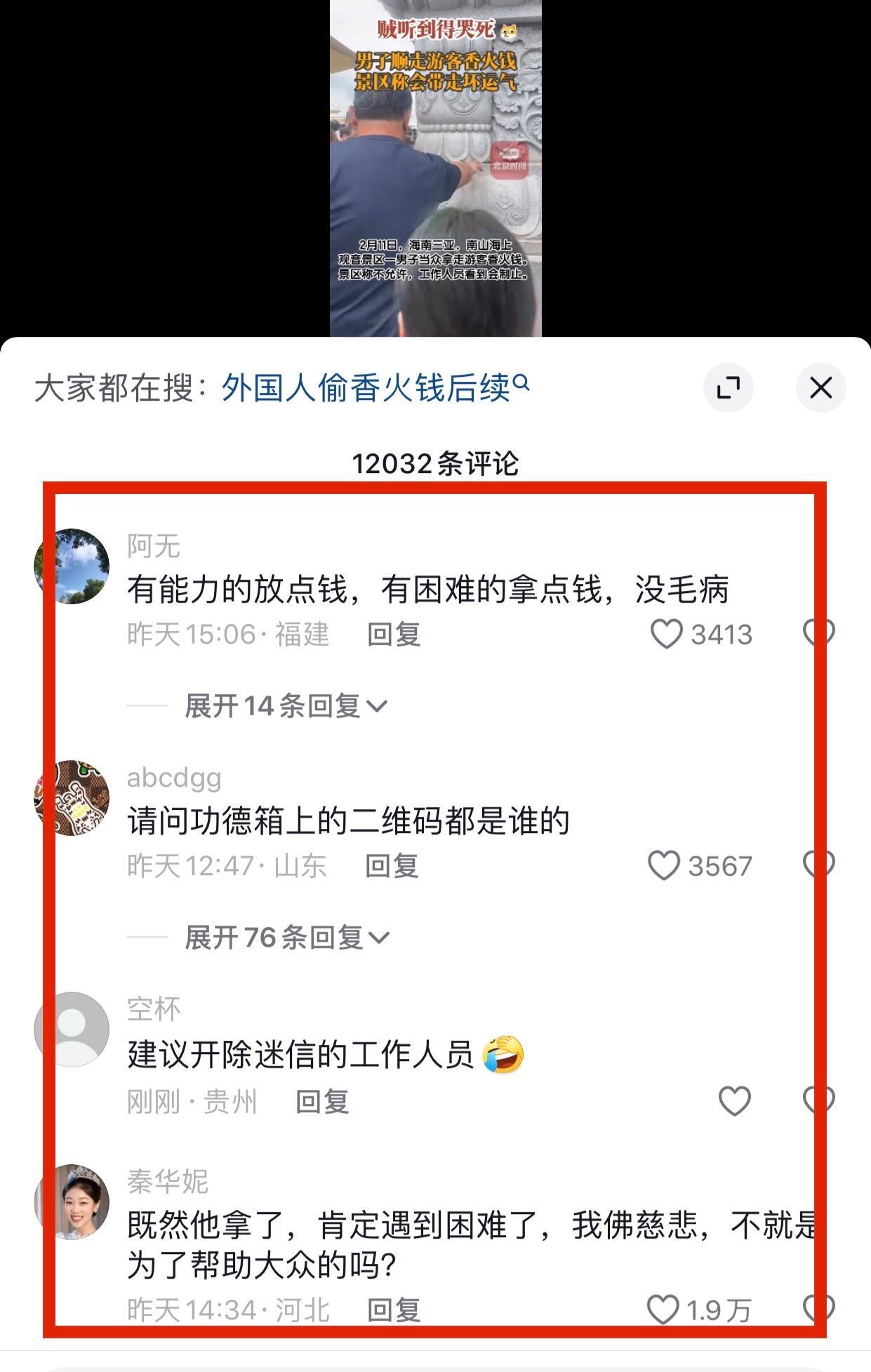 至於隨手順走香火錢,從視頻角度來看,也就不下幾十上百元,數額不大,只是大衆一種道德譴責而已,可能也犯不上什麼罪過、觸犯不了什麼法律事情,並且一個大男人在大衆面前公然拿走,跟乞討沒兩樣,說不定人家真有困難需要,網上搜索一下關於盜竊景區或者寺廟功德箱案例大有人在,《九派新聞》2024年1月29日報道過一起男子多次盜竊寺廟功德箱8000元被判刑,還有更多這種案例,有金額小的也有金額大的。