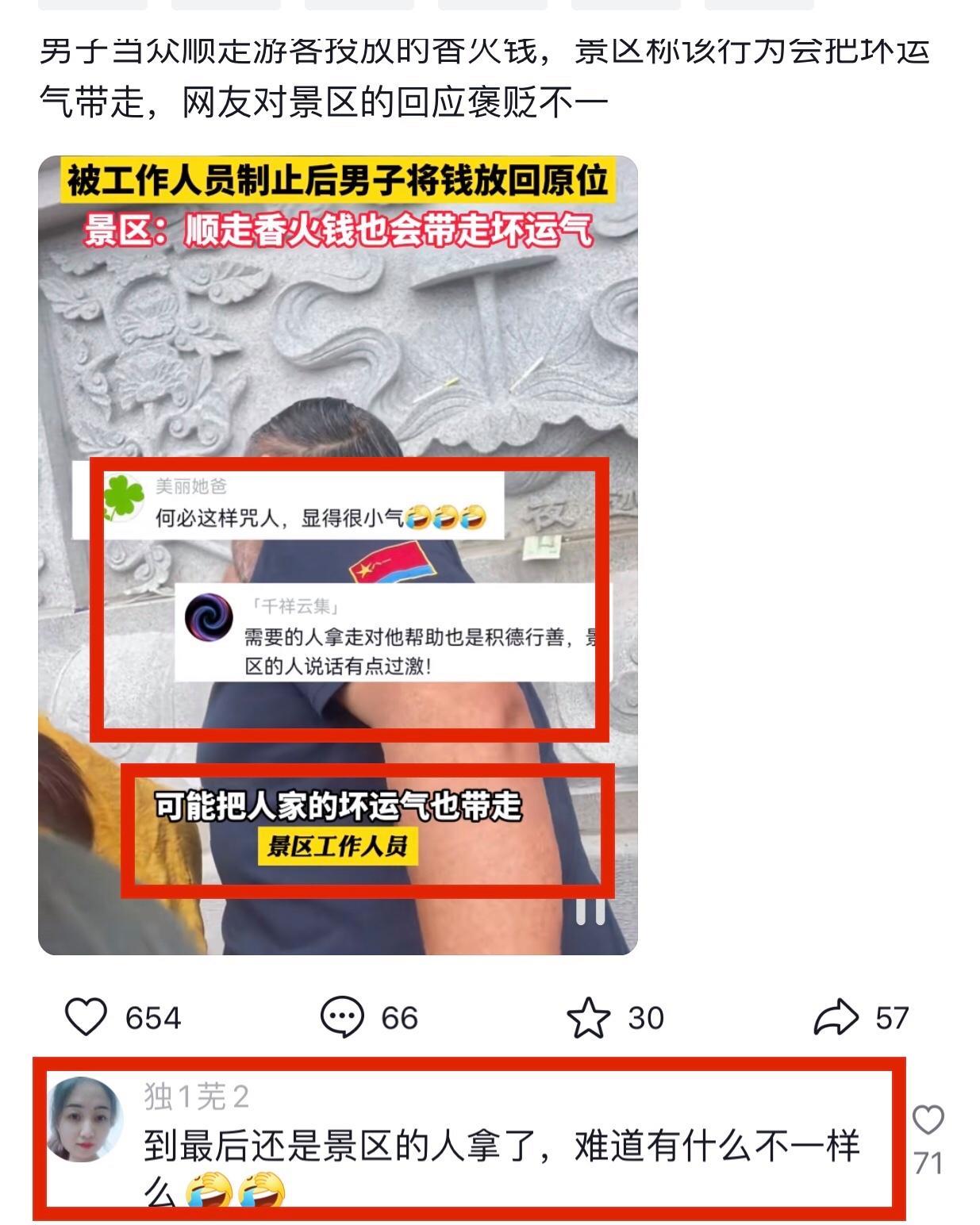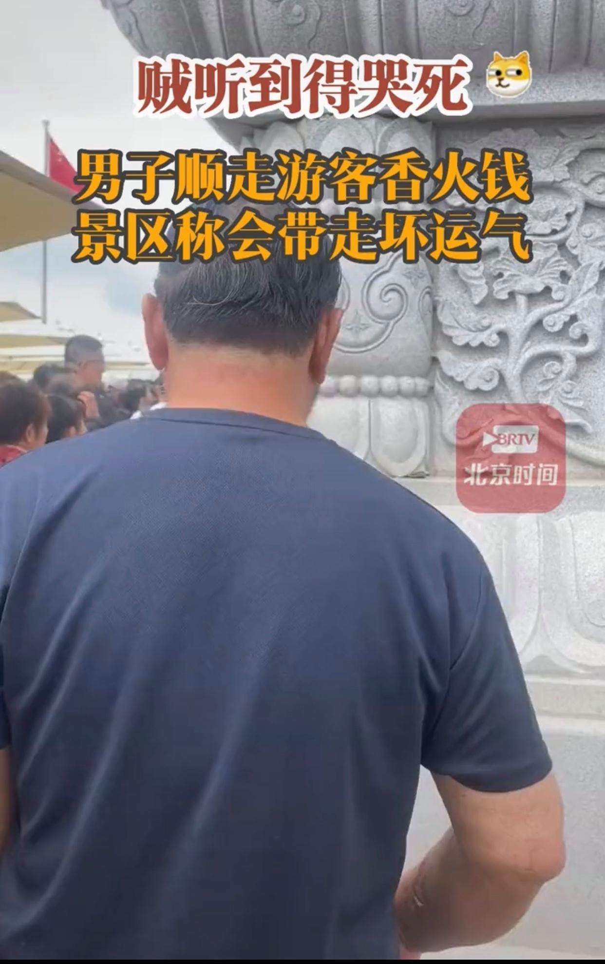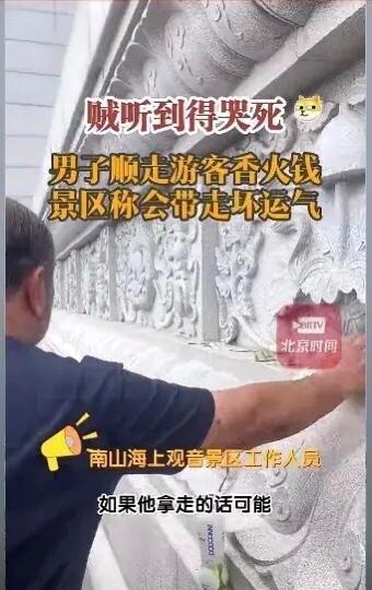 景區工作人員作出了回覆,她說可能這兩天工作人員太忙,沒顧得上監督,如果現場看到這種行爲會阻止,他說佛祖腳下功德錢是別人放在哪裏消災祈福保平安,如果這名遊客拿走了,可能會帶走人家的壞運氣,最後工作人員說會將此事上報給景區保安管理部門處理。