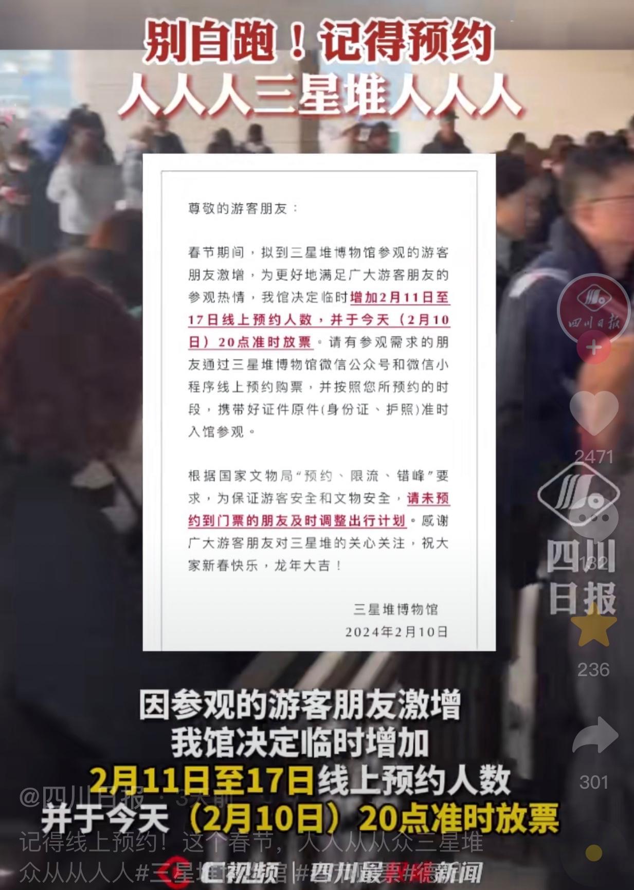 7、三星堆博物館,一個充滿神祕色彩的古蜀文明,由於青銅器缺少文字記錄,一直激發大衆好奇心,三星堆博物館是年輕人最喜歡的博物館,這個春節假期遊客暴漲,三星堆博物館2月10日發文稱遊客必須提前預約,沒預約到門票建議別空跑,多位遊客現場拍攝視頻來看,三星堆門口遊客排隊成長龍等待檢票參觀,這個春節只看到景區擁堵,博物館擁堵可能三星堆是第一個,平時我們網上看到博物館擁堵就是陝西曆史博物館,沒想到三星堆博物館也人山人海。