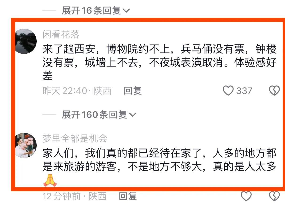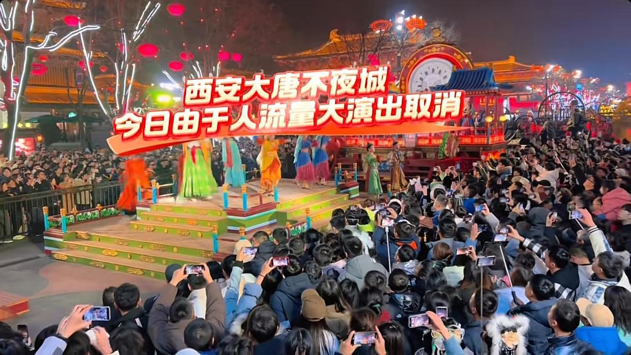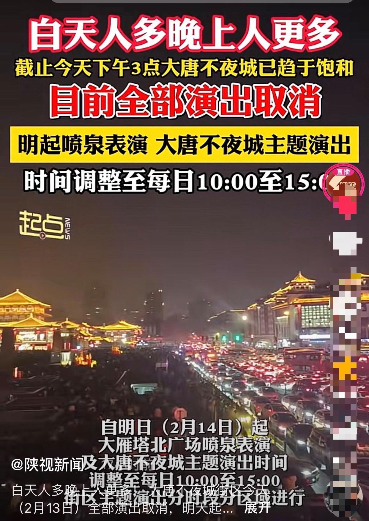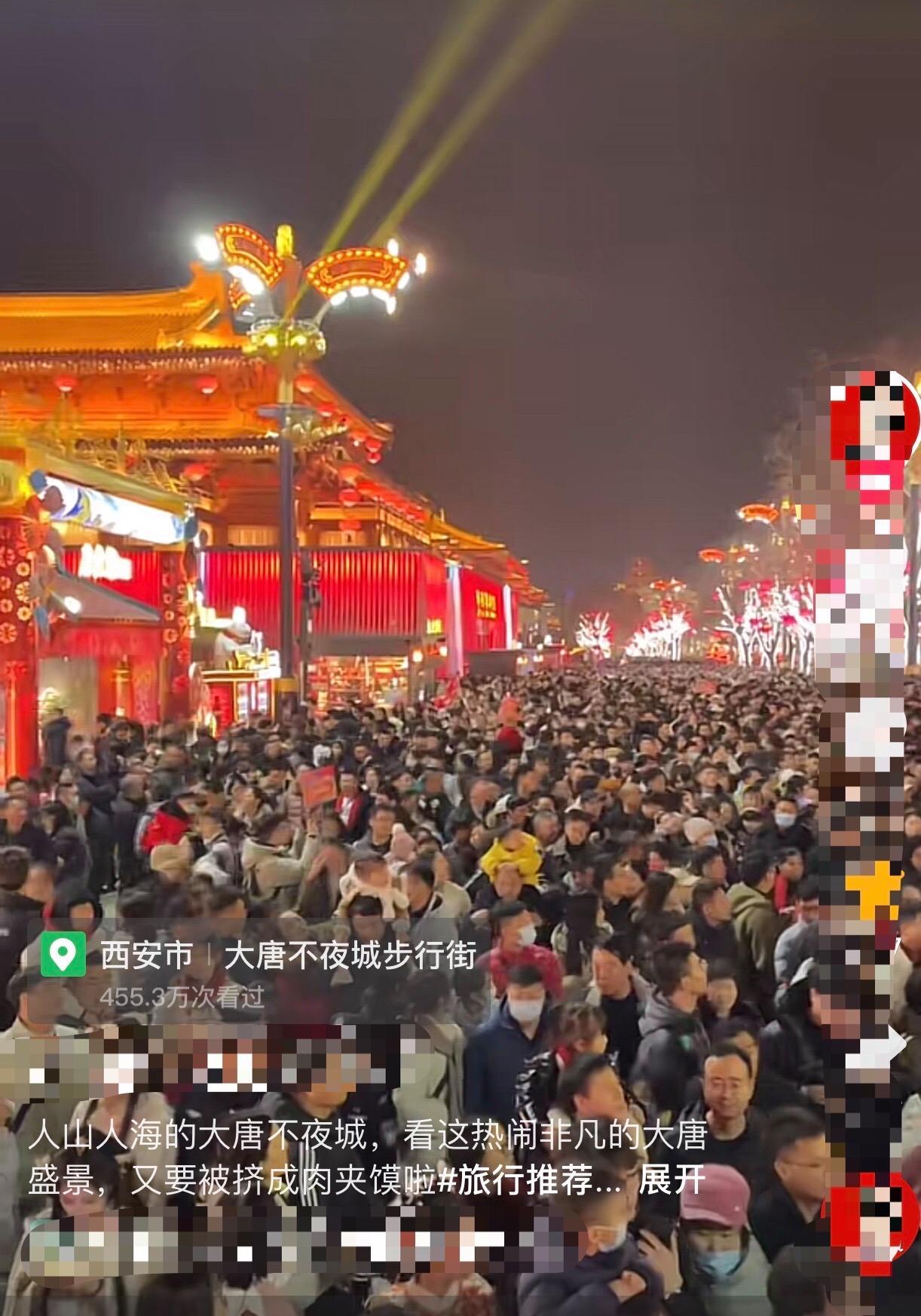 3、西安大唐不夜城,重現大唐盛世風貌,之所以火爆是這裏演出吸睛,今年大唐不夜城遊客知多少,由於今年春晚分會場在西安,西安憑藉實力又把自己火了一把,2月12日《陝視新聞》發佈消息,由於遊客太多,大唐不夜城所有演出全部取消,來西安旅遊的一名網友留(閒看花落)留言說:來了趟西安,博物院約不上,兵馬俑沒有票,鐘樓沒有票,城牆上不去,不夜城表演取消。體驗感好差。西安的網友(夢裏全都是機會,回覆說:家人們,我們真的都已經待在家了,人多的地方都是來旅遊的遊客,不是地方不夠大,真的是人太多。