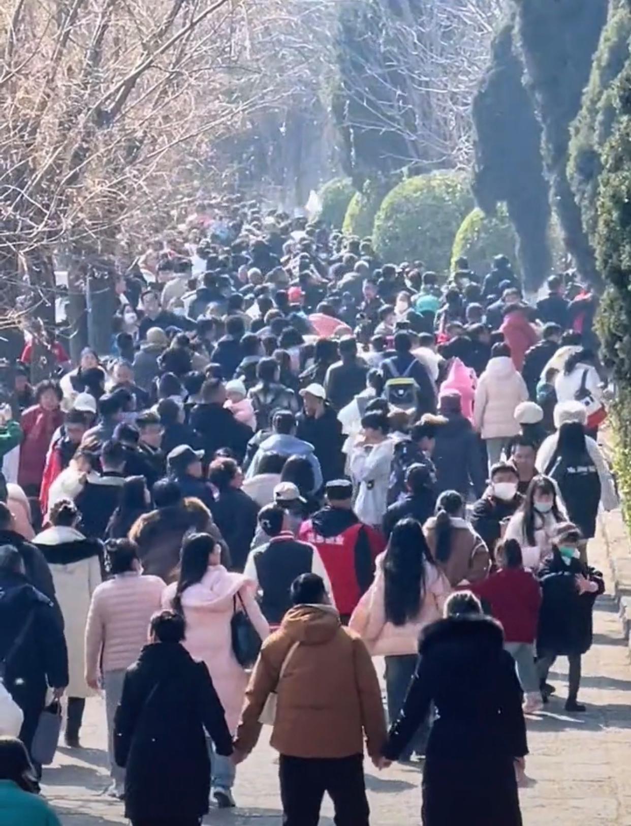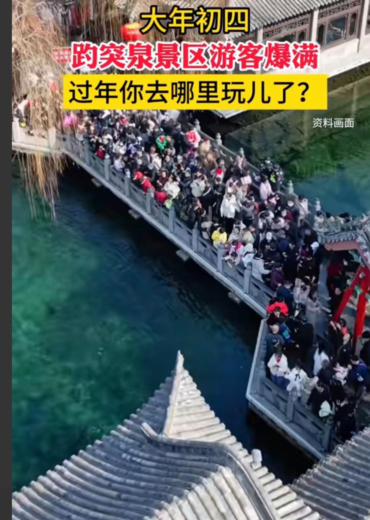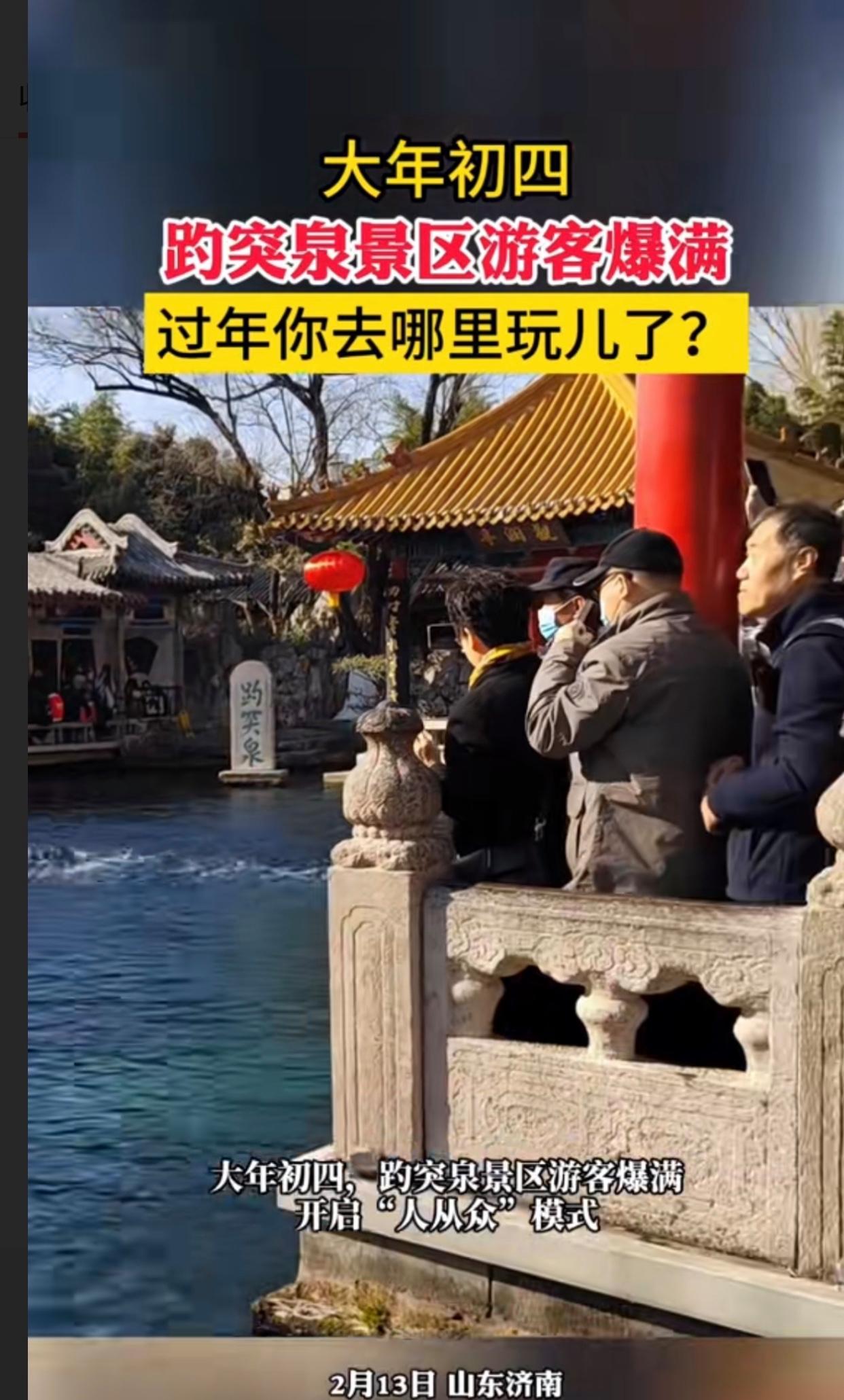 2、濟南趵突泉,山東濟南泉城之首名泉,因爲上了教科書,很多人會跟着課本去旅遊,趵突泉是到濟南旅遊就是必打卡一遊,大年初四趵突泉景區遊客排起長龍,現場氣氛熱烈,張燈結綵,一股濃郁的春節年味,一度登上旅遊熱榜,有網友說趵突泉因爲擁擠是大家進園就是盯着那一口泉在看。