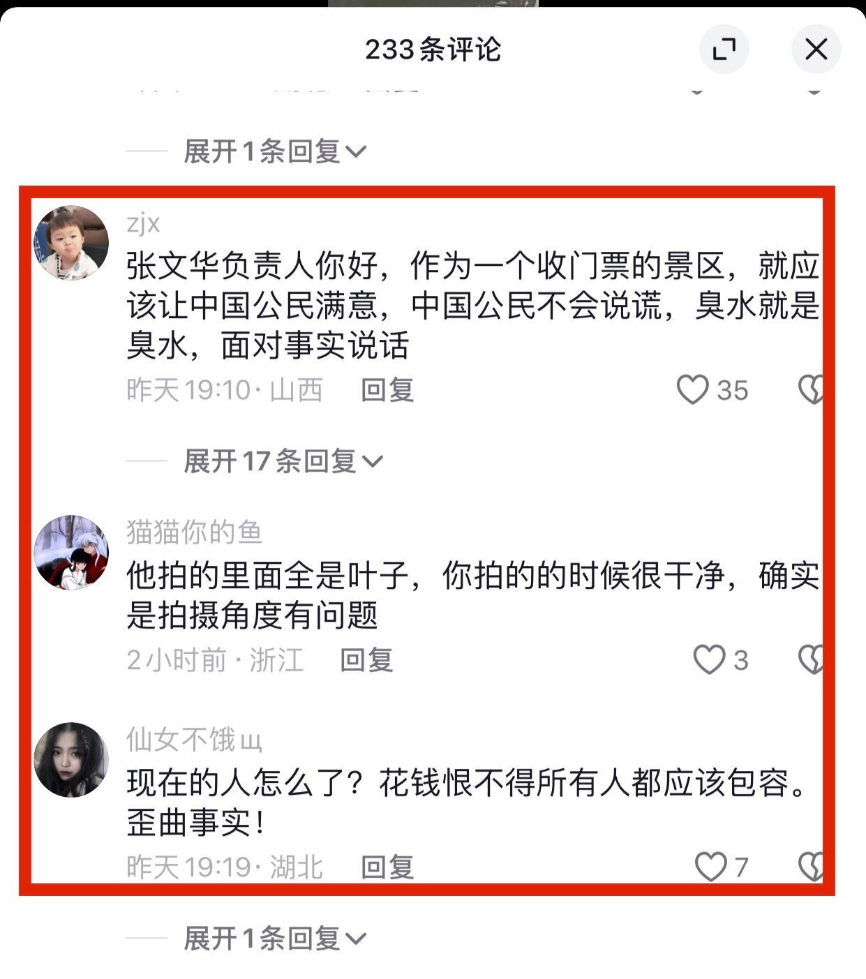 然而視頻一直網上發酵,衝上旅遊熱榜,景區工作人員出面闢謠,說女遊客吐槽事情不符,工作人員親自到女遊客拍攝水塘邊拿杯子取水,證明池塘的水清澈透明,並且水質無異味,工作人員說池塘裏有黃菖蒲、睡蓮、虎尾藻等植物,還有小魚,冬季目前處於休眠期,植物沒有葉子,土壤暴露出來出現黑色狀態,可能是市民遊客誤解了,《光明網》報道景區負責人說春夏兩季景區池塘一個月換一次水。