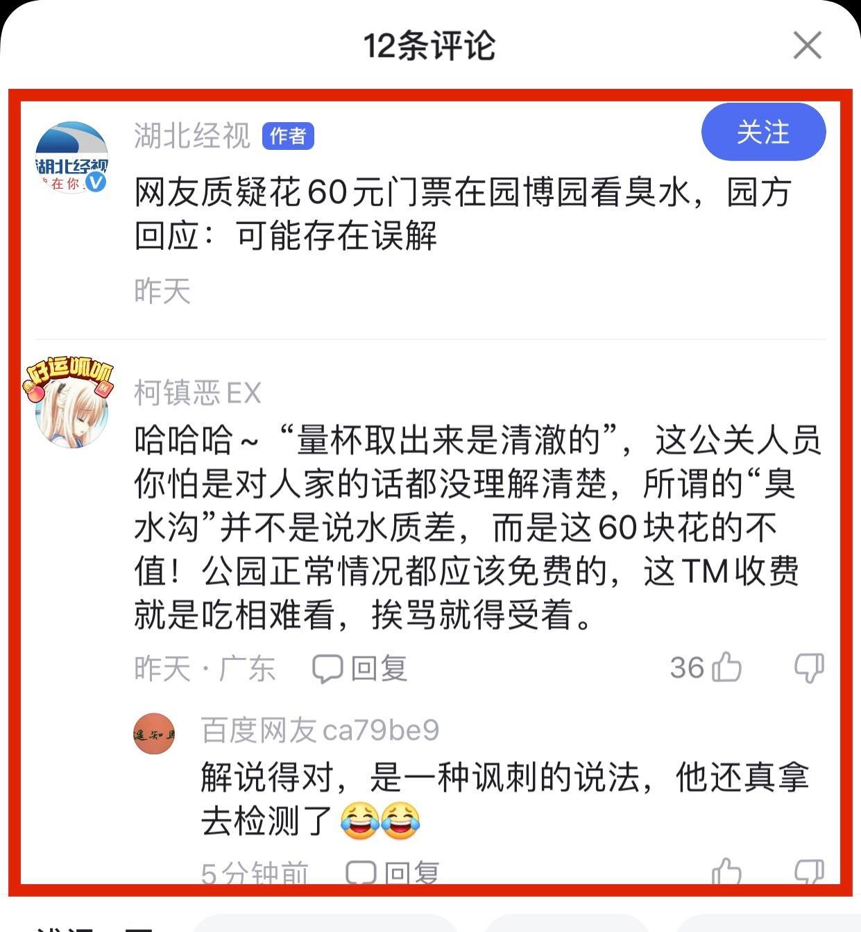 1,哈哈哈~ “量杯取出來是清澈的”,這公關人員你怕是對人家的話都沒理解清楚,所謂的“臭水溝”並不是說水質差,而是這60塊花的不值!公園正常情況都應該免費的。